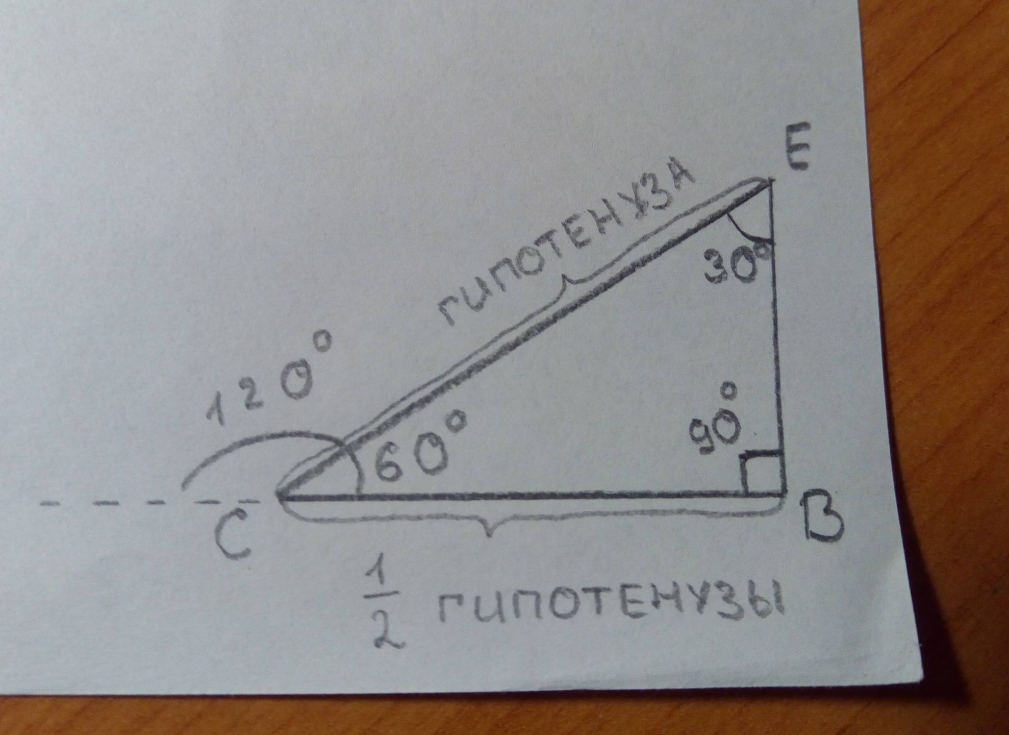 В прямоугольном треугольнике ВСЕ с прямым углом В внешний угол при вершине С равен 120°, СВ+СЕ=12,3см. Найти СВ и СЕ.