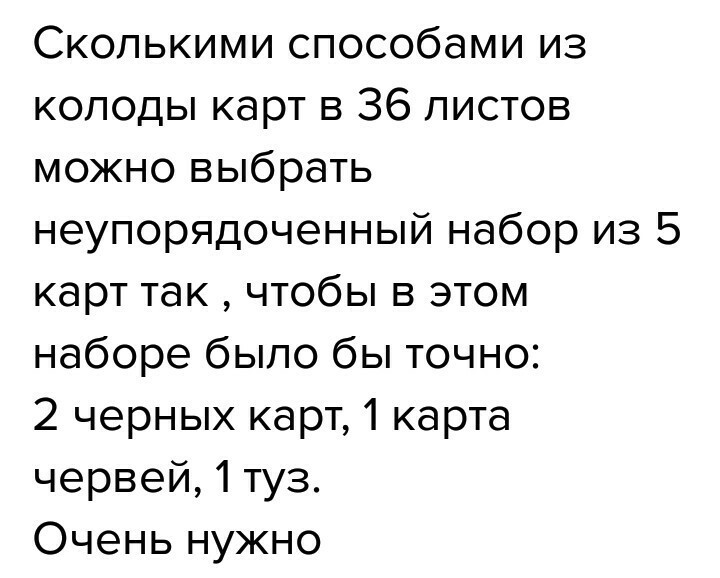 Решение: Из условия известно, что в нужно выбрать 5 карт, при этом хотя бы 4 и более карт крестовые. Я думаю, что это означает, что выбрано не менее четырех крестовых карт (4 или 5) и одна карта точно туз, т.е. 4 карты точно кресты без туза и одна это туз, в том числе и крестовый.