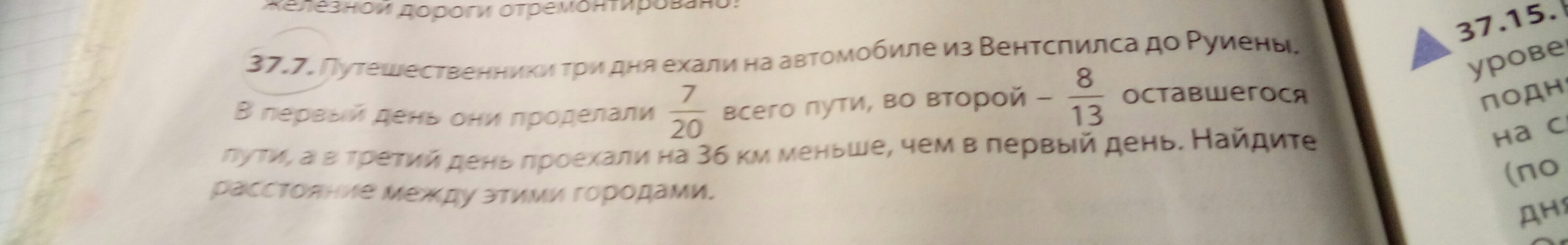1 - весь путь1-7/20=20/20-7/20=13/20 (осталось после 1-го дня)13/20*8/13=8/20 (пути проехали во 2-й день)7/20+8/20=15/20=3/4 (пути проехали за 2 дня)1-3/4=4/4-3/4=1/4 (проехали в 3-й день)7/20-1/4=7/20-5/20=2/20=1/10 (на столько больше проехали в 1-й день. чем в 3-й), но это 36 км по условию задачи, тогда36 км *10 = 360 км (весь путь)