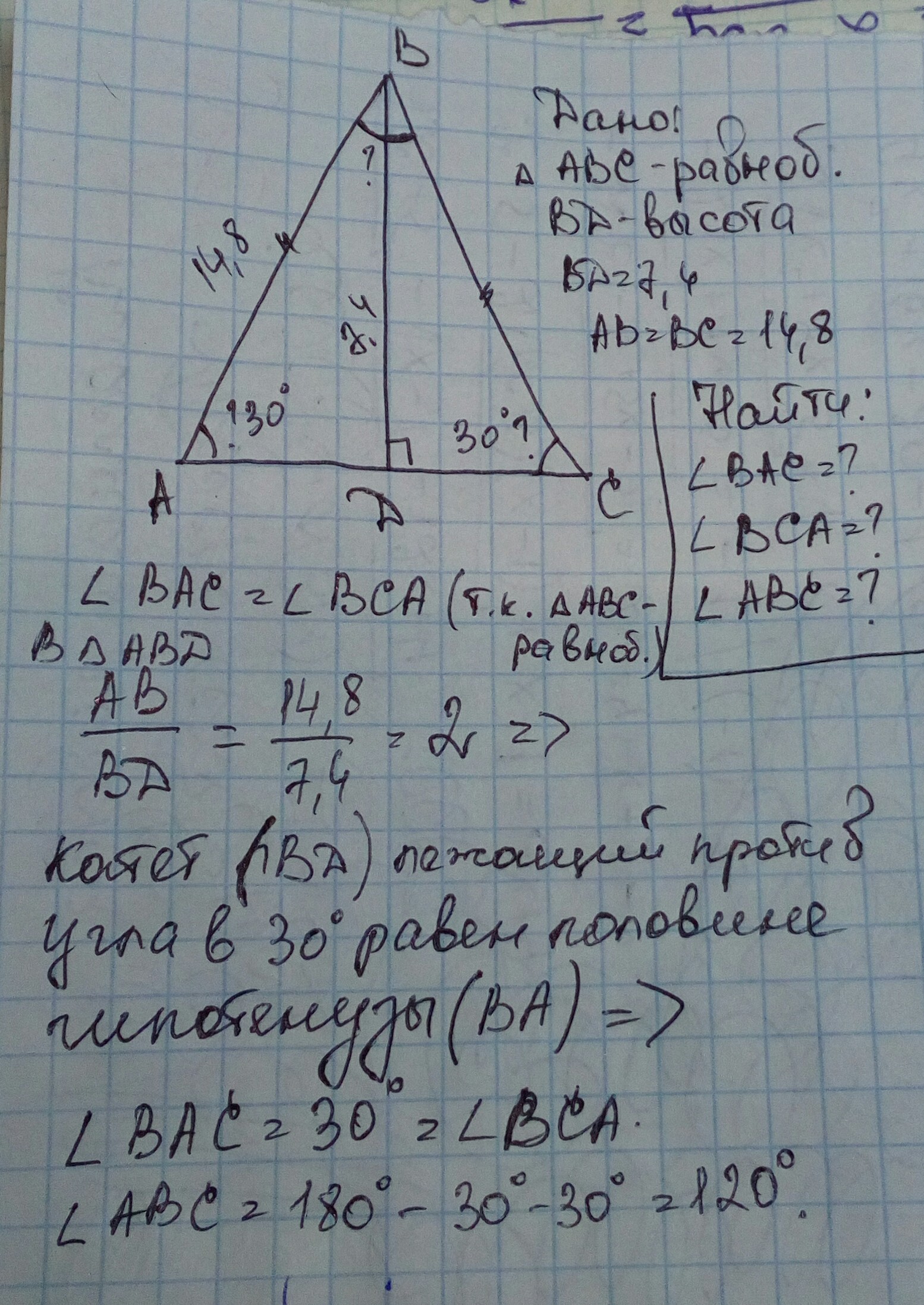 В равнобедренном треугольнике ABC проведена высота BD к основанию AC. Длина высоты — 7,4 см, длина боковой стороны — 14,8 см. Определи углы этого треугольника.