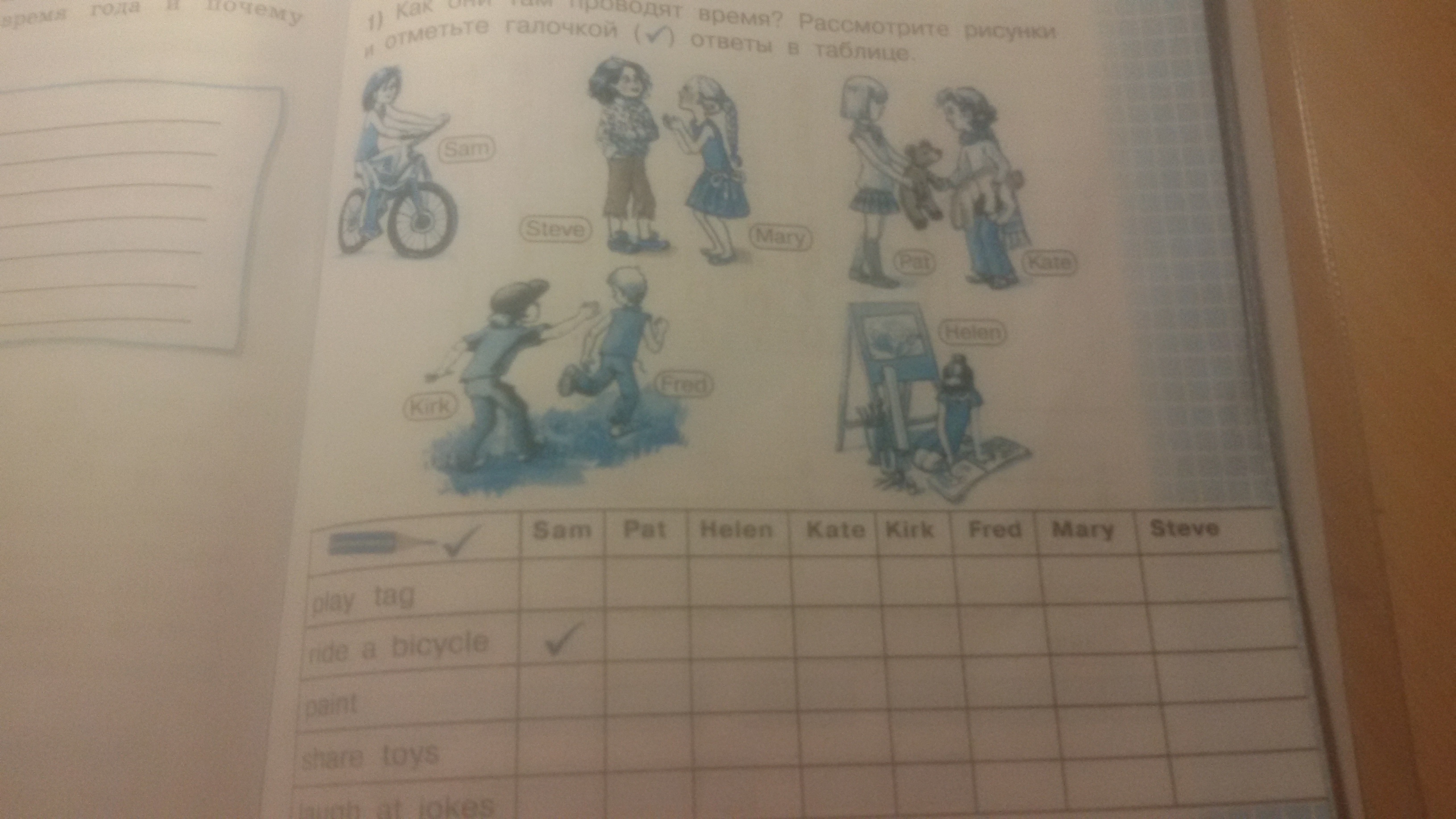 1) Как они там проводят время? Рассмотрите рисунки и отметьте галочкой ответы в таблице