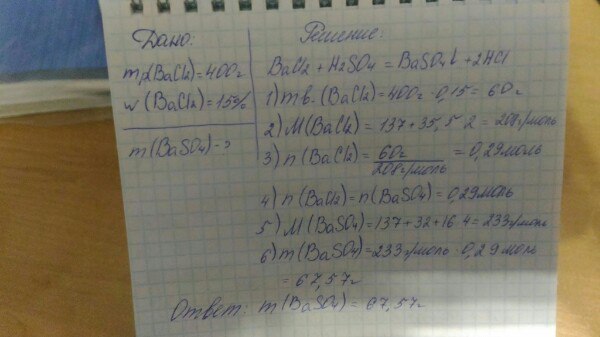 К 400 г 15%-ного раствора хлорида бария прилили избыток раствора серной кислоты. Определите массу выпавшего осадка.