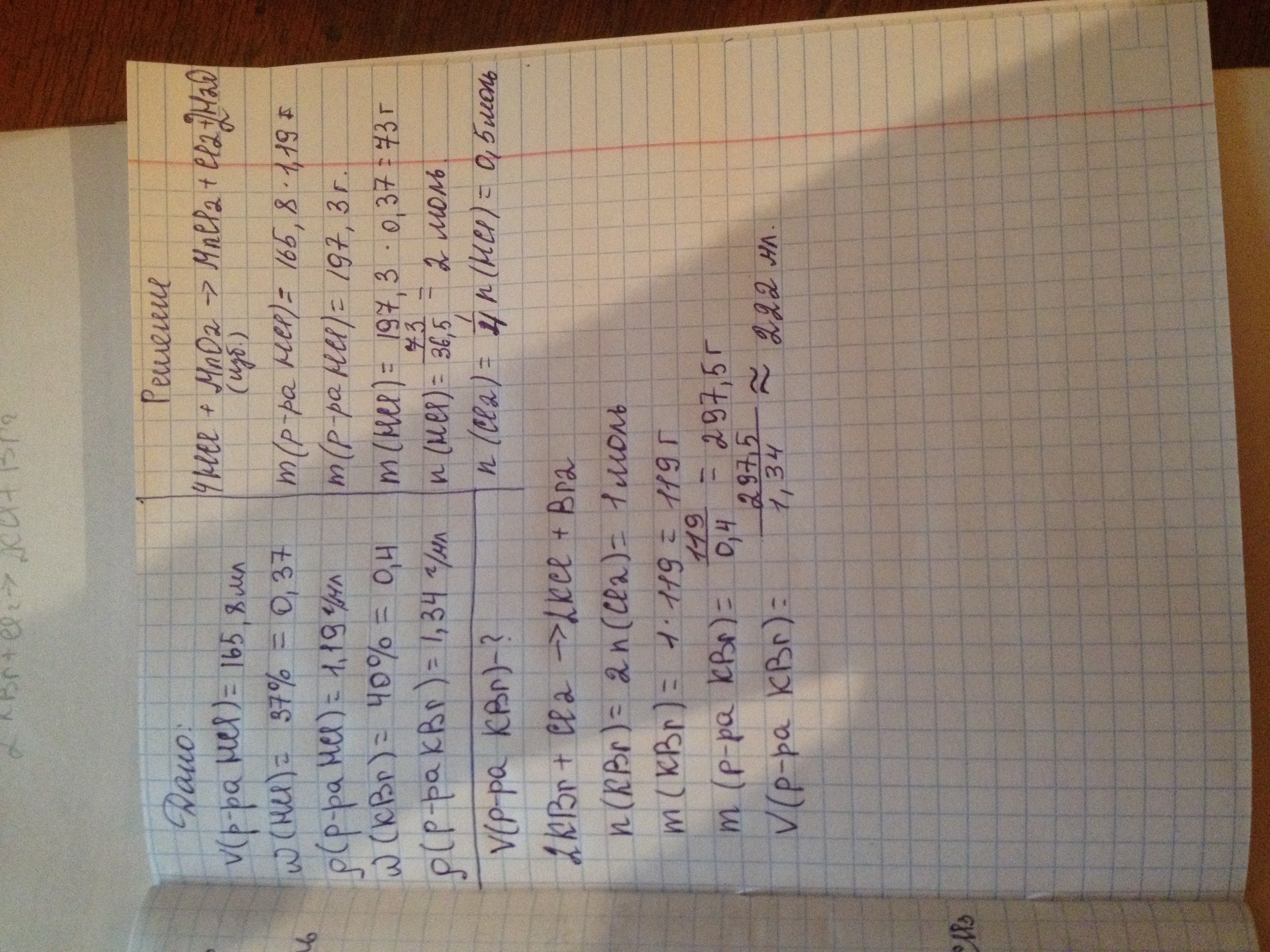 С диоксидом марганца, взятого в избытке, прореагировало 165,8 мл 37% раствора соляной кислот пл. 1,19. Образовавшийся газ был полностью поглощен раствором бромида калия. Сколько мл 40% растворам бромида калия пл 1,34 было израсходовано в этой реакции?
