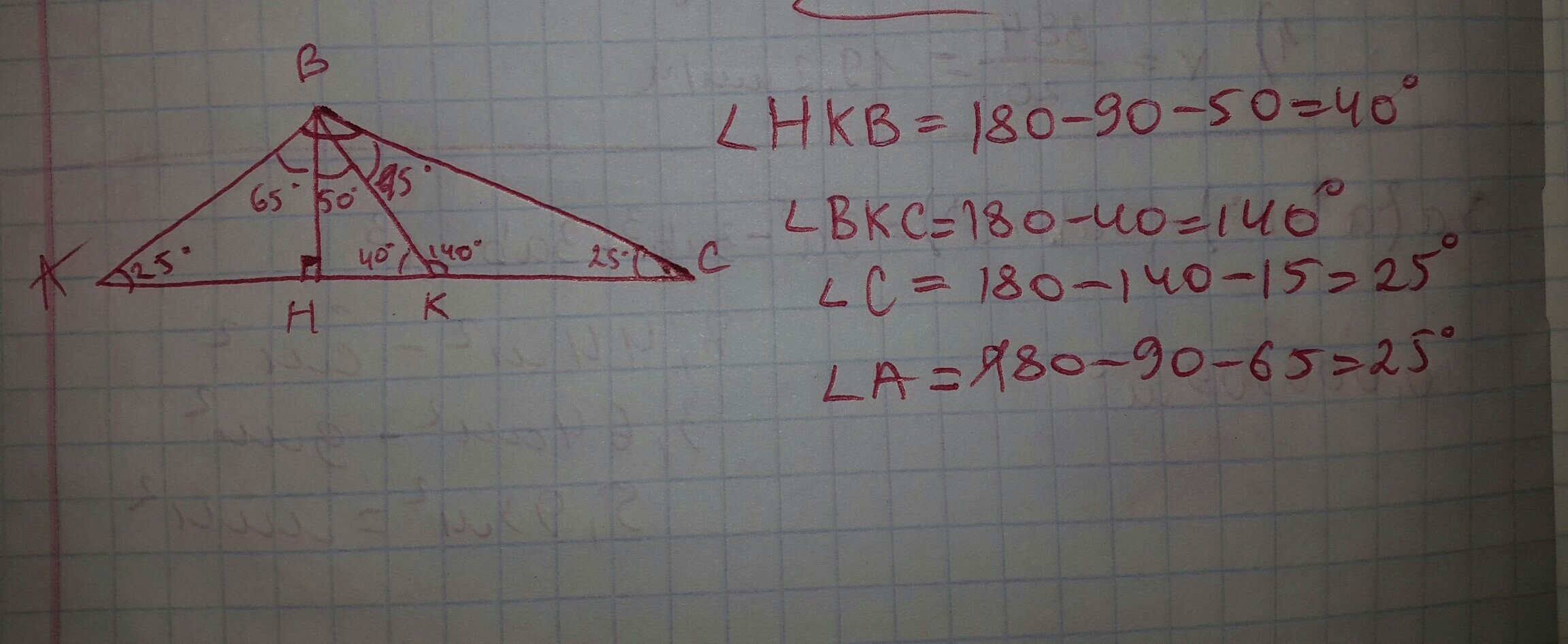Высота отсекает от треугольника прямоугольный треугольник с острым углом между высотой и боковой стороной 15°. (65°-50°=15°). Сумма острых углов треугольника 90°. Поэтому второй острый угол этого треугольника будет 90°-15°=75°. Получится, что сумма двух углов треугольника 130°+75°=205°, чего быть не может. А есть ведь ещё и третий угол.