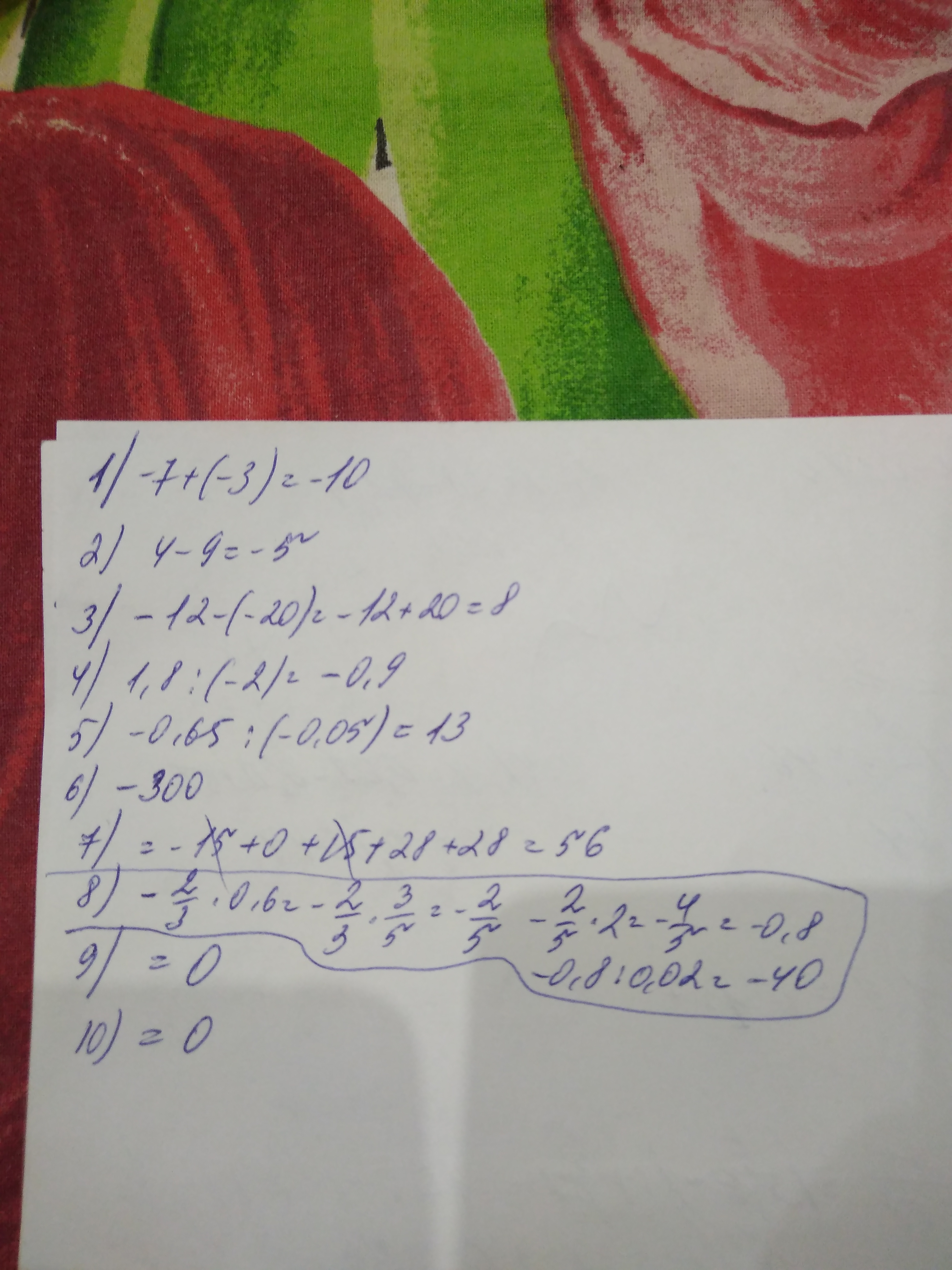 1. Чему равна сумма чисел: -7 и -3 А) -4 Б) 4 В) -10 Г) 10 2. Найдите значение выражения: 4 - 9 А) 5 Б) -5 В) 13 Г) -13 3. Найдите значение выражения: -12-(-20) А) -32 Б) 32 В)8 Г) -8 4. Найдите значение выражения: 1,8 : (-2) А) -9 Б) 9 В) 0,9 Г) -0,9 5. Найдите значение выражения: -0,65 : (-0,05) А) -13 Б) 13 В) 1,3 Г) -1,3 6. Найти наименьшее число из чисел: 2; -300; -30; -29; -7; -9; 0; 1; -1 Ответ:__________________ 7. Вычислите: -15+0+15-(-28)+28 Ответ:__________________ 8. Вычислите: ((-2/3)•0,6)2:0,02 Ответ:__________________ 9. Вычислите: -4,7•10•(-1,8) •0•10,5•(-13) Ответ:__________________ 10. Вычислите: -4,7•10•(-1,8) •0•10,5•(-13) Ответ:__________________ Ответы к тесту Тест 3 Номер задания 1 2 3 4 5 6 7 8 9 10 Буква ответа или ответ