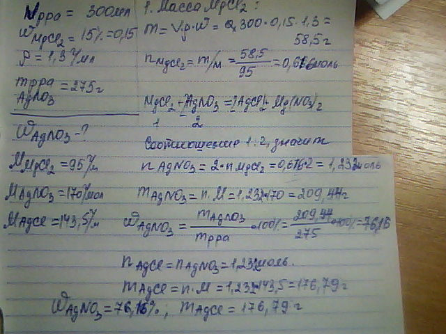 К 300 мл 15% р-ра МgCl2 1.3 г/мл прилили 275 грамм р-ра AgNO3 до выпадения осадка.Найдите w (AgNO3). Найти m осадка