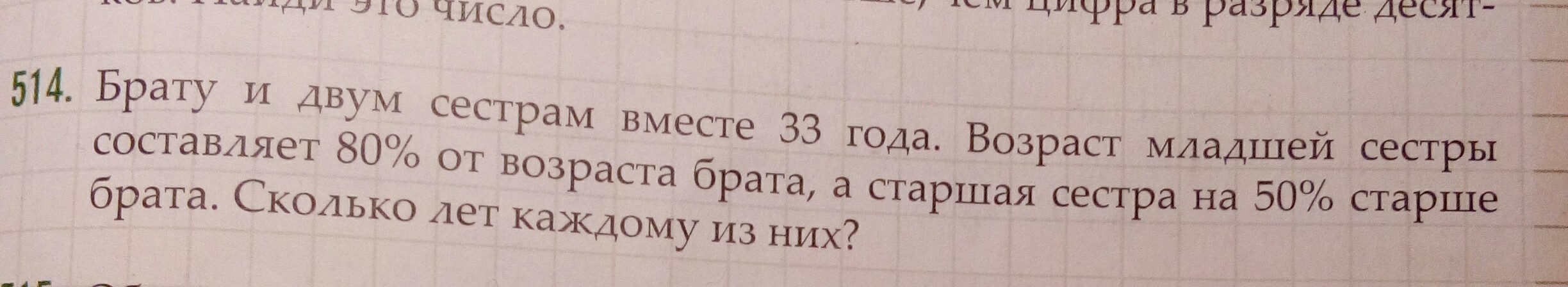 брату и двум Сестрам вместе 33 года. Возраст младшей сестры составляет 80% от возраста брата, а старшая сестра на 50% старше брата Сколько лет каждому из них