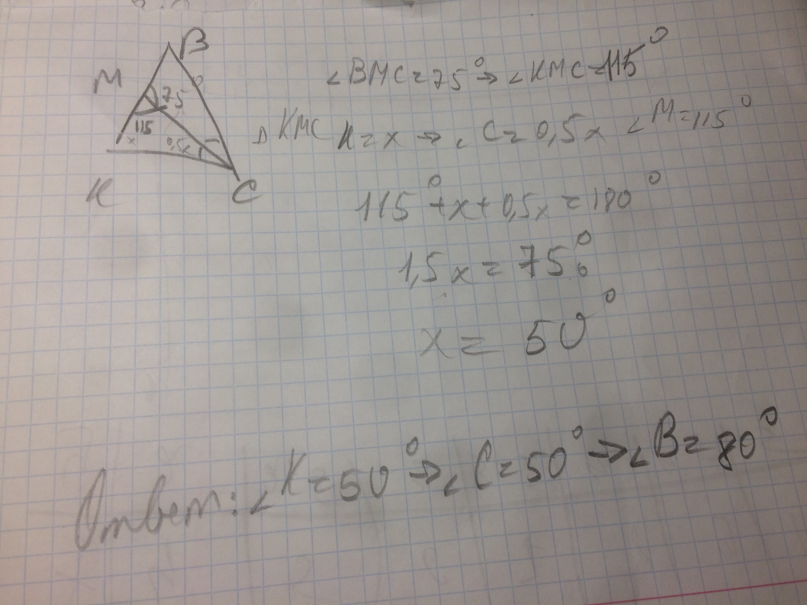 В равнобедренном треугольнике KBC проведена биссектриса CM угла C у основания KC. CMB=75°. Определи величины углов данного треугольника