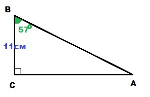 В треугольнике АВС угол С=90 градусам,угол В=57 градусов,ВС=11 см.Найдите длину АС