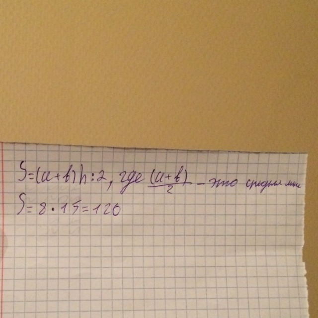 найдите площадь трапеции, высота и средняя линия которой равны 8 и 15 соответственно
