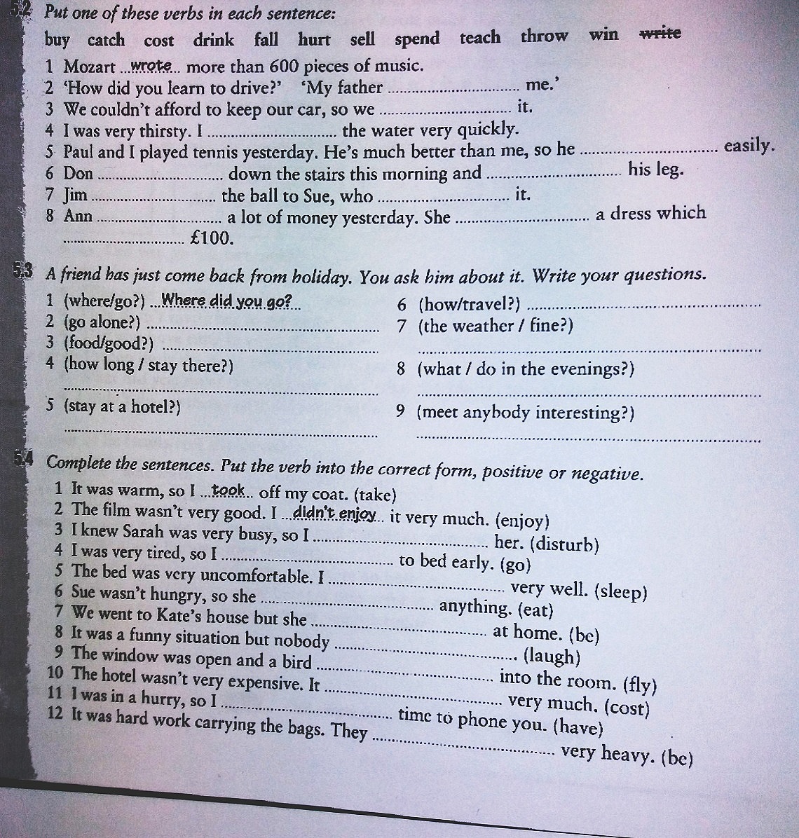 5.2 2. taught 3. sold 4. drank 5. won 6. fell; hurt 7. threw; caught 8. spent; bought; cost