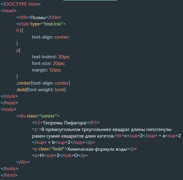 <div class="center"> <h1>Теоремы Пифагора:</h1> <p >В прямоугольном треугольнике квадрат длины гипотенузы равен сумме квадратов длин катетов.<br>c<sup>2</sup> = a<sup>2</sup> + b<sup>2</sup></p> <p class="bold">Химическая формула воды</p> <p>H<sub>2</sub>O</p> </div>