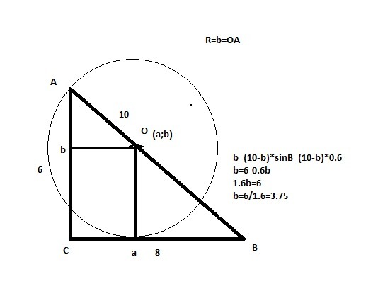 В прямоугольном треугольнике ABC гипотенуза AB = 10 см, а катет AC = 6 см. Найдите: А) Высоту, проведенную к гипотенузе; Б) Радиус окружности с центром на гипотенузе, которая касается катета CB и проходит через точку A.