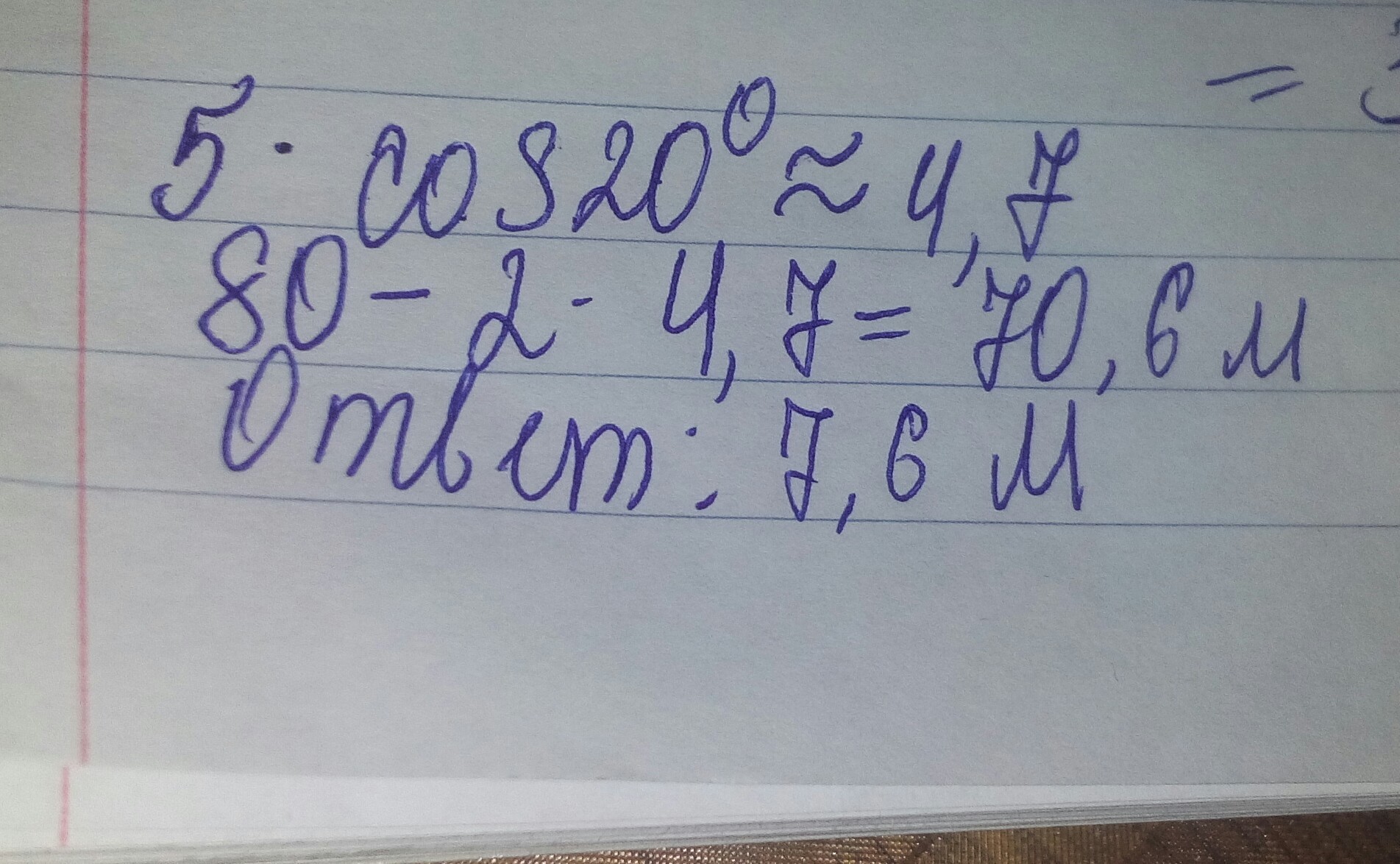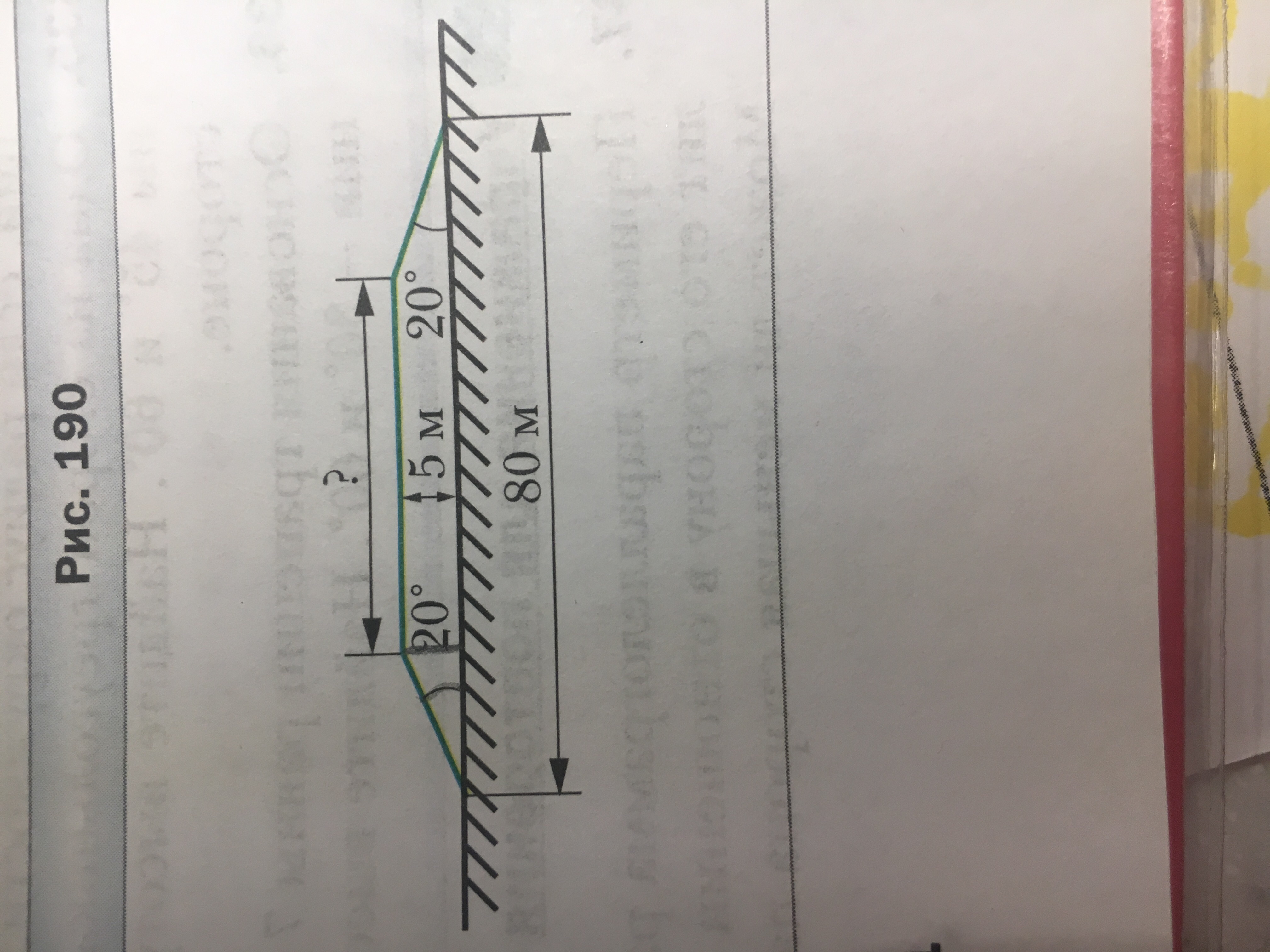 Ширина насыпи шоссейной дороги в нижней её части равна 80 м, высота-5м, а откосы наклонены к горизонту под углом 20 градусов. Найдите ширину насыпи в верхней её части.