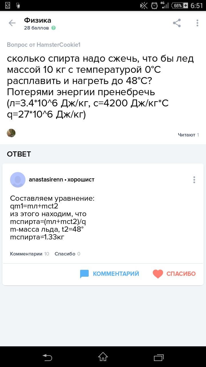 Сколько спирта нужно сжеч, чтобы лёд массой 10 кг с темпиратурой 0градуслвC расплавился и нагреть до 48градуслвC. потерями энергии принебреч (лянда-3,4*10^2 дж/кг, c-4200дж/кг*градусC, q-27*10^2 дж/кн