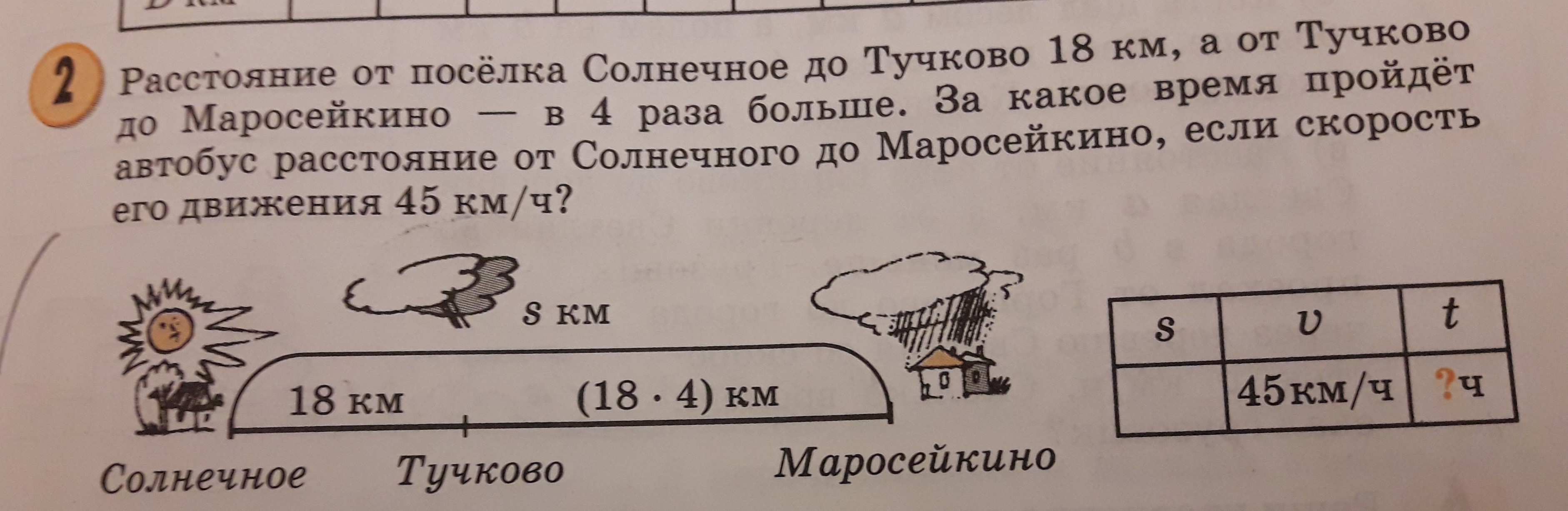 растояние от посёлка Солнечное до тучкино 18км а от тучково до марасейкино а 4 раза больше за какое время пройдёт автобус расстояние от солнечного до марасейкино если скорость автобуса 45км/ч