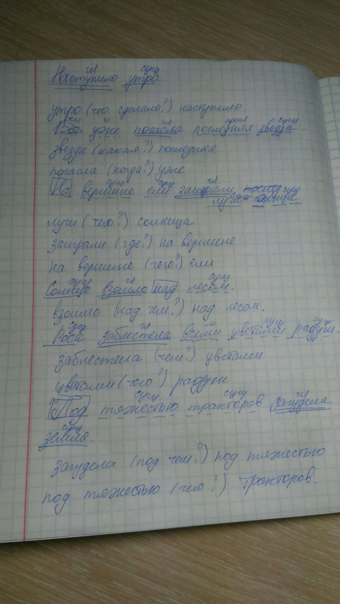 выполныть польный разбор предложений. выписать словосочетания, над всеми словами указать части речи. (Наступило утро. Вот уже погасла последняя заезда. На вершине ели заиграли лучи солнца. Солнце взошло над лесом. Роса заблестела всеми цветами радуги. Под тяжестью тракторов загудела земля)