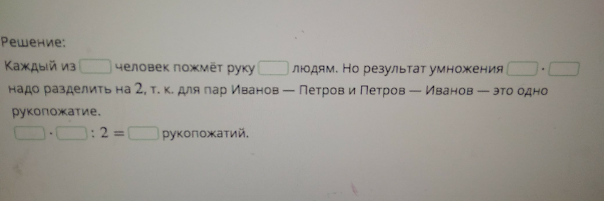 10 человека обменялись рукопожатиями Сколько всего было рукопожатий было впишите числа в решение. комбинаторные задачи.