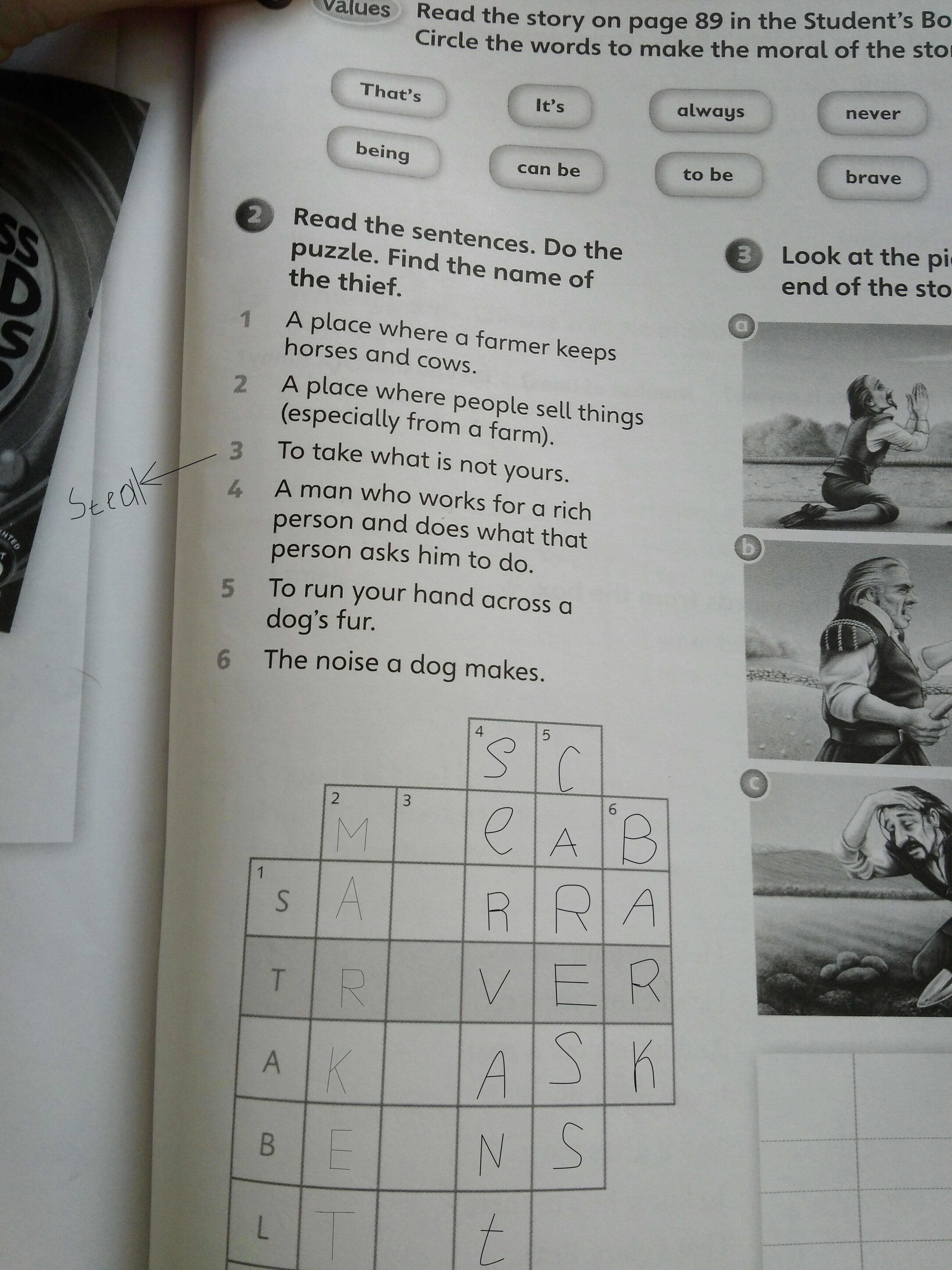 В 3-ем должно быть слово steal, но одной буквы в нём не хватает, поэтому не знаю, будет ли правильно.