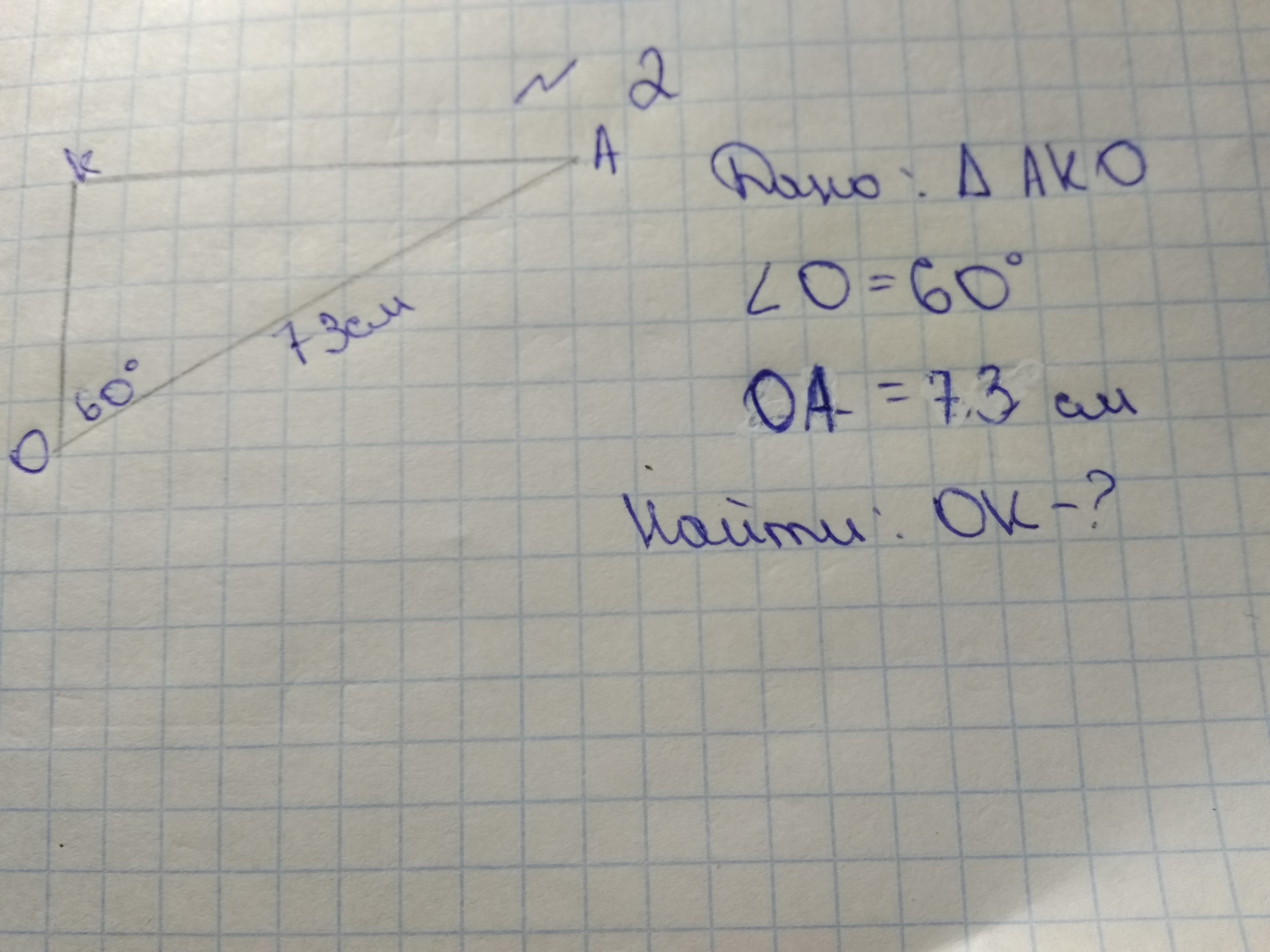 Т.к треугольник AKO прямоугольный можно найти угол А=180-(90+60)=30.