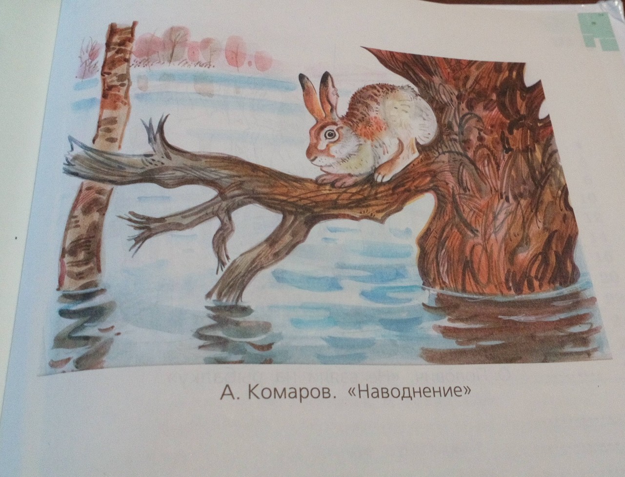 На картине А. Н. Комарова «Наводнение» — ранняя весна. Однако это время года приносит лесным зверушкам не только радость теплых солнечных дней, но и неприятности, и даже настоящую беду.