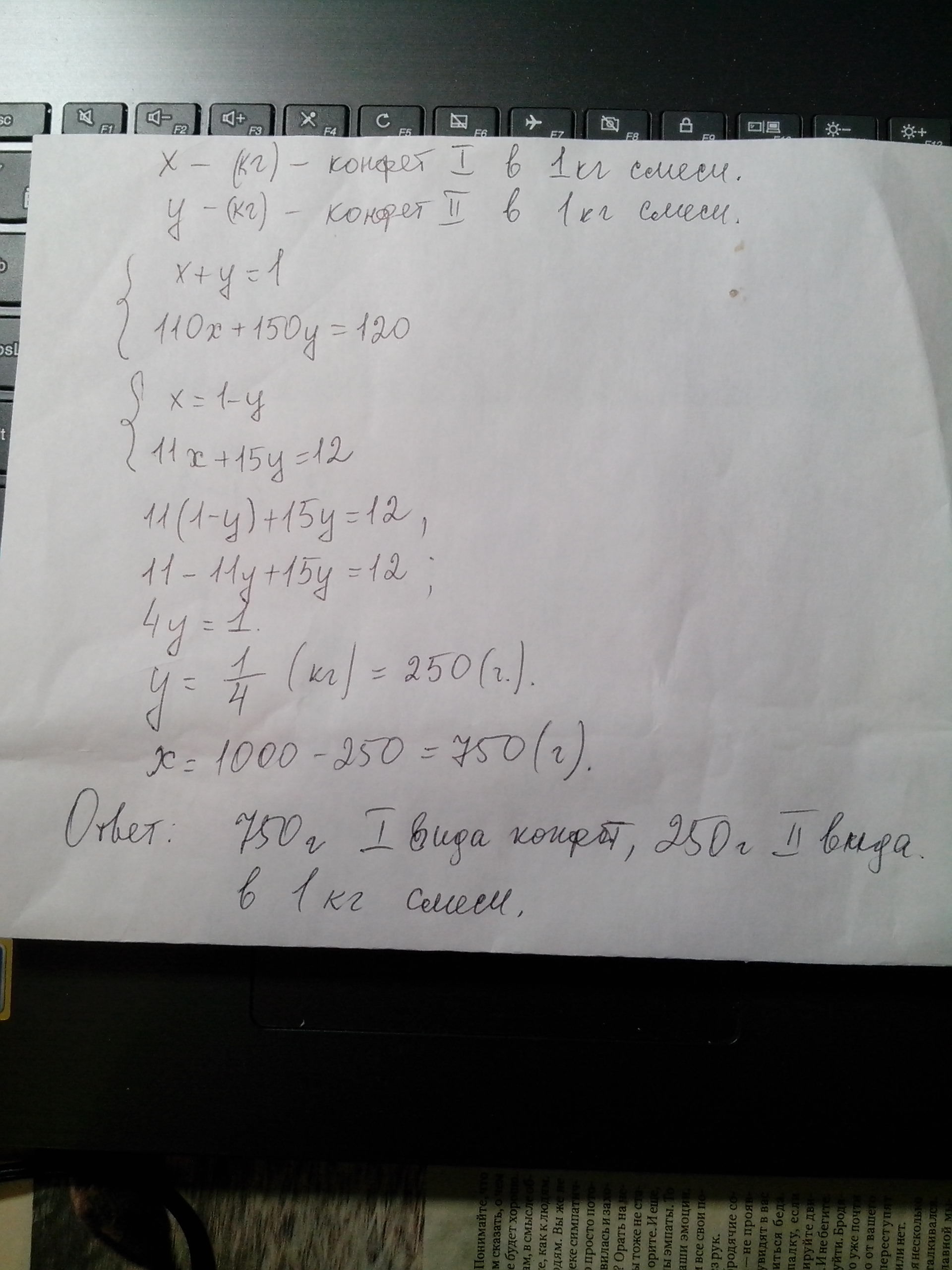 В магазине смешали конфеты по 110 р. и по 150 р. за килограмм и получили смесь по 120 р. за килограмм. Сколько конфет того и другого сорта содержится в килограмме смеси?Решите с помощью системы