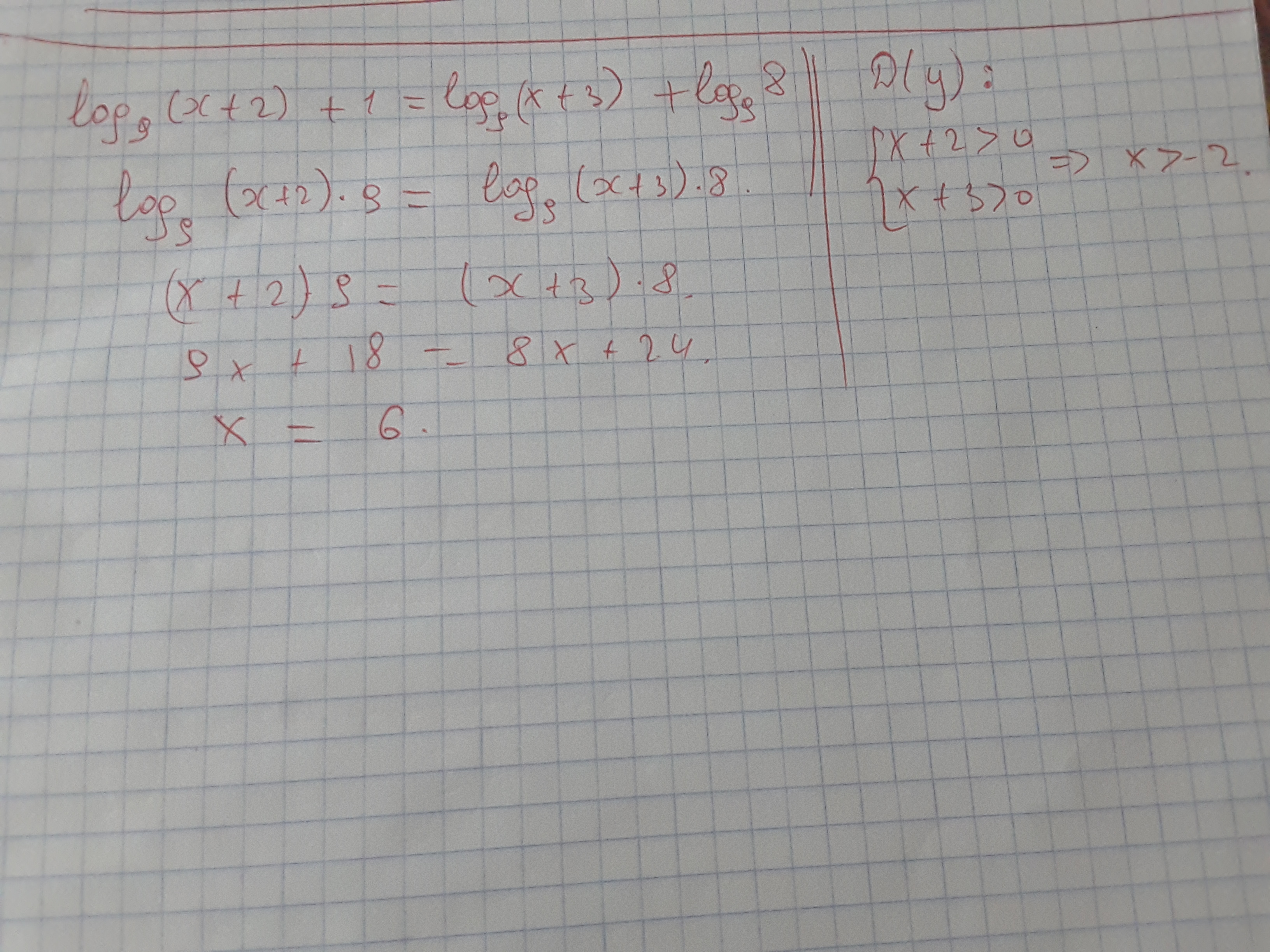 Я как-то так поняла задачу: log9 (x+2) +1=log9 (x+3) + log9 (8)