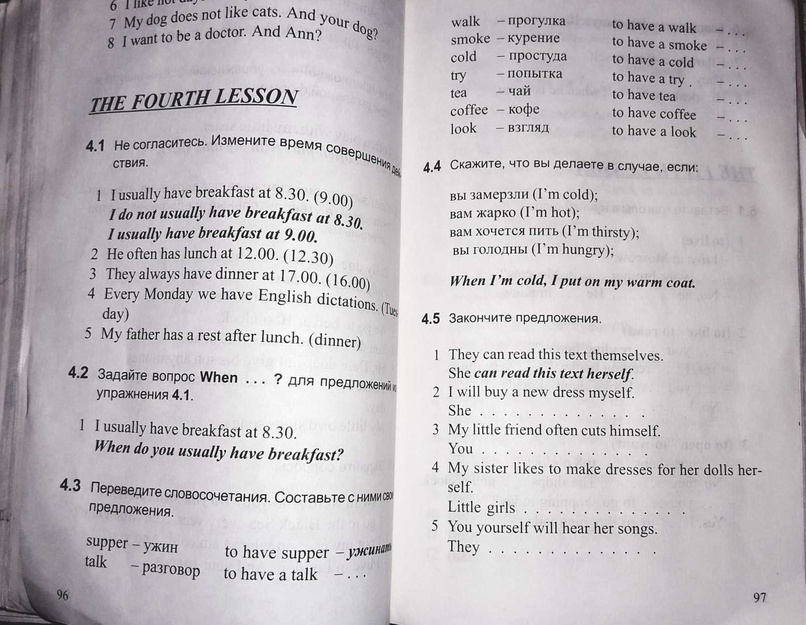 Говорить, гулять, курить, простыть, пытаться, пить чай, пить кофе, смотреть.
