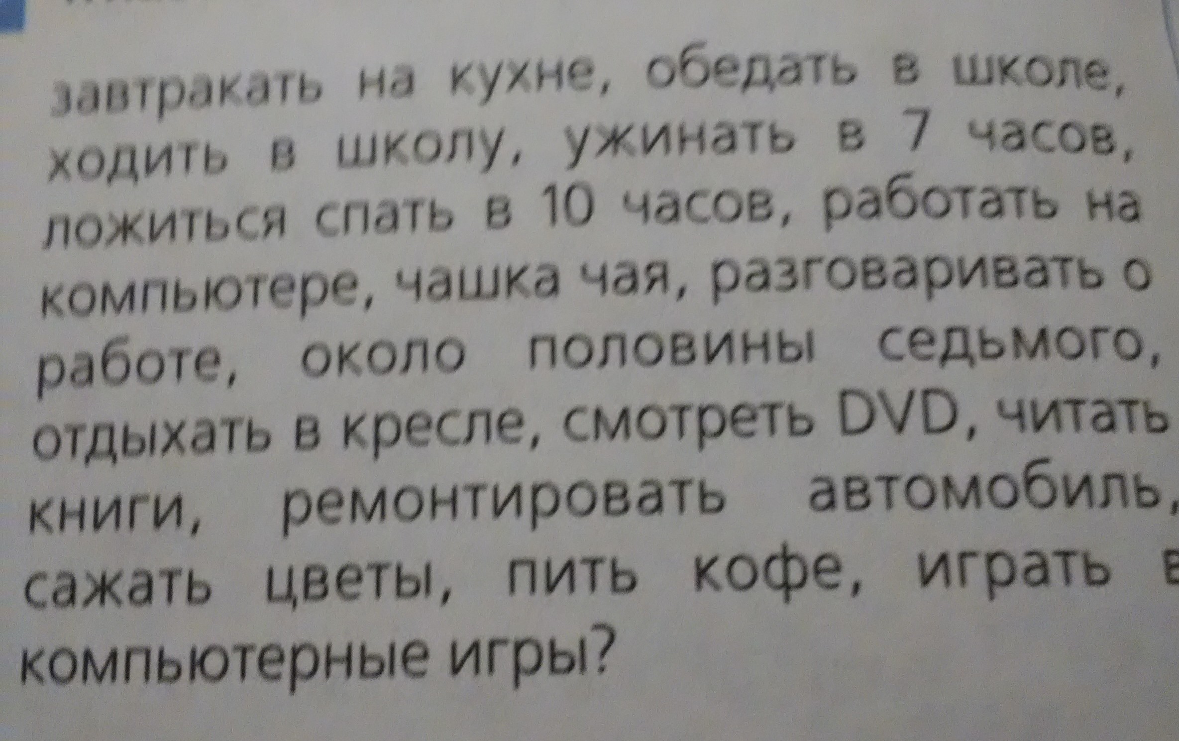 Breakfast in the kitchen, lunch at school, dinner at 7: 00, go to bed at 10: 00, work on a computer, a Cup of tea, talk at work, about half past seven, relax in a chair, watch DVDs, read books , repair a car, plant flowers, drink coffee, play computer games?