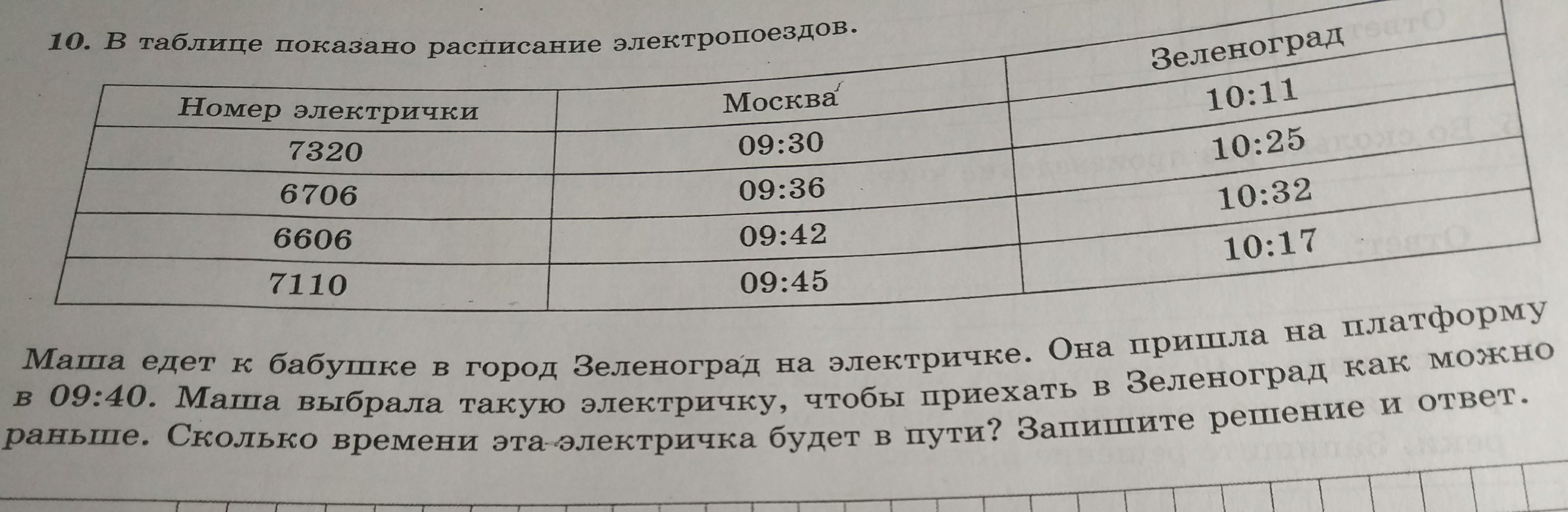 Маша едет К бабушке в город Зеленоград на электричке она пришла на платформу в 9:40 Маша выбрала такую электричку чтобы приехать в зеленоград как можно раньше сколько времени это электричка будет в пути