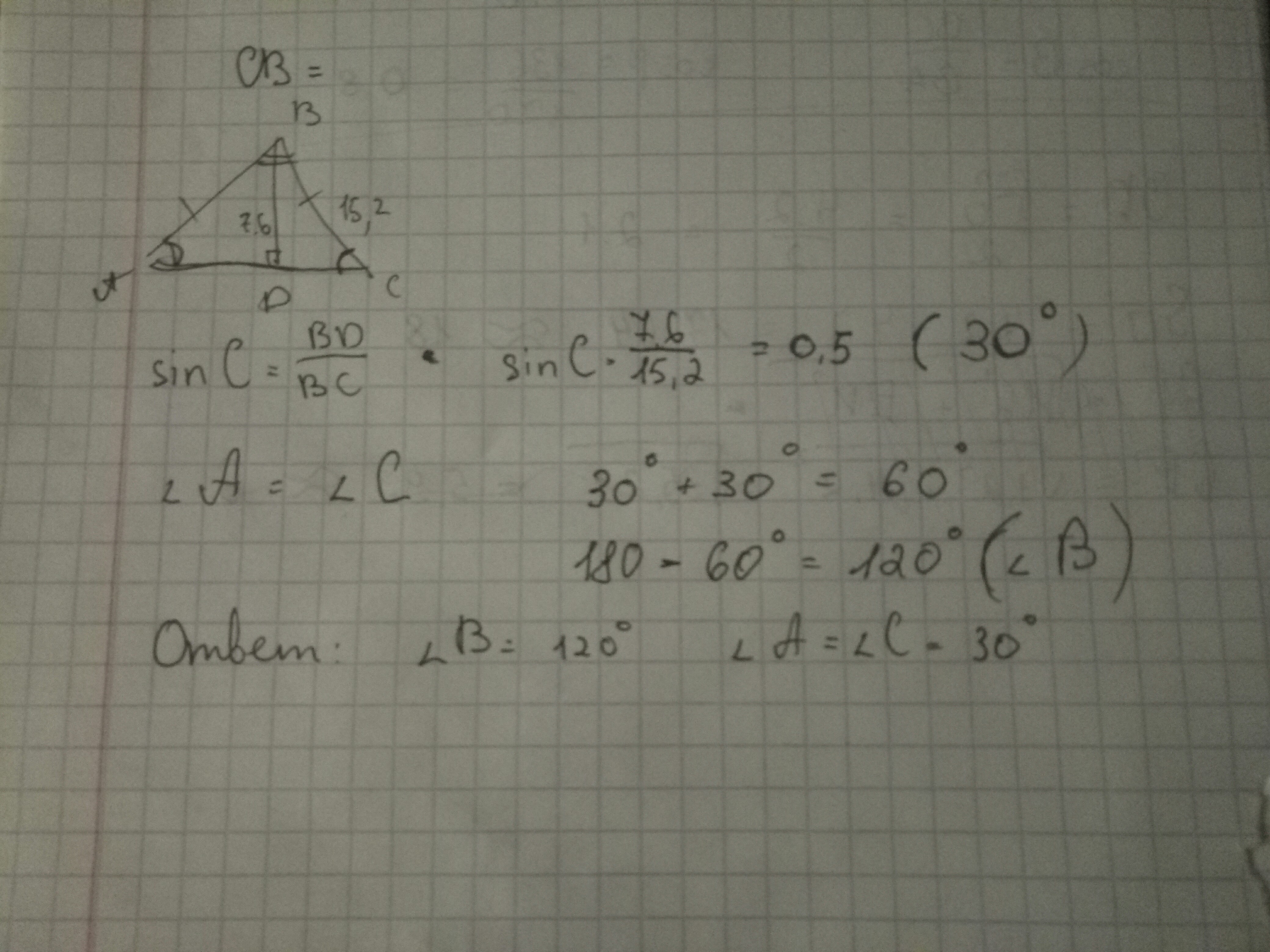 Высота проведённая к основанию равнобедренного треугольника равна 7,6см а боковая сторона треугольника равна 15,2 см найдите углы этого этого треугольника