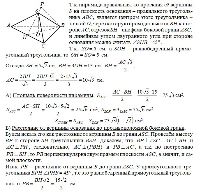 Высота основания правильной треугольной пирамиды равна 5 см, а двугранный угол при стороне основания равен 45°.