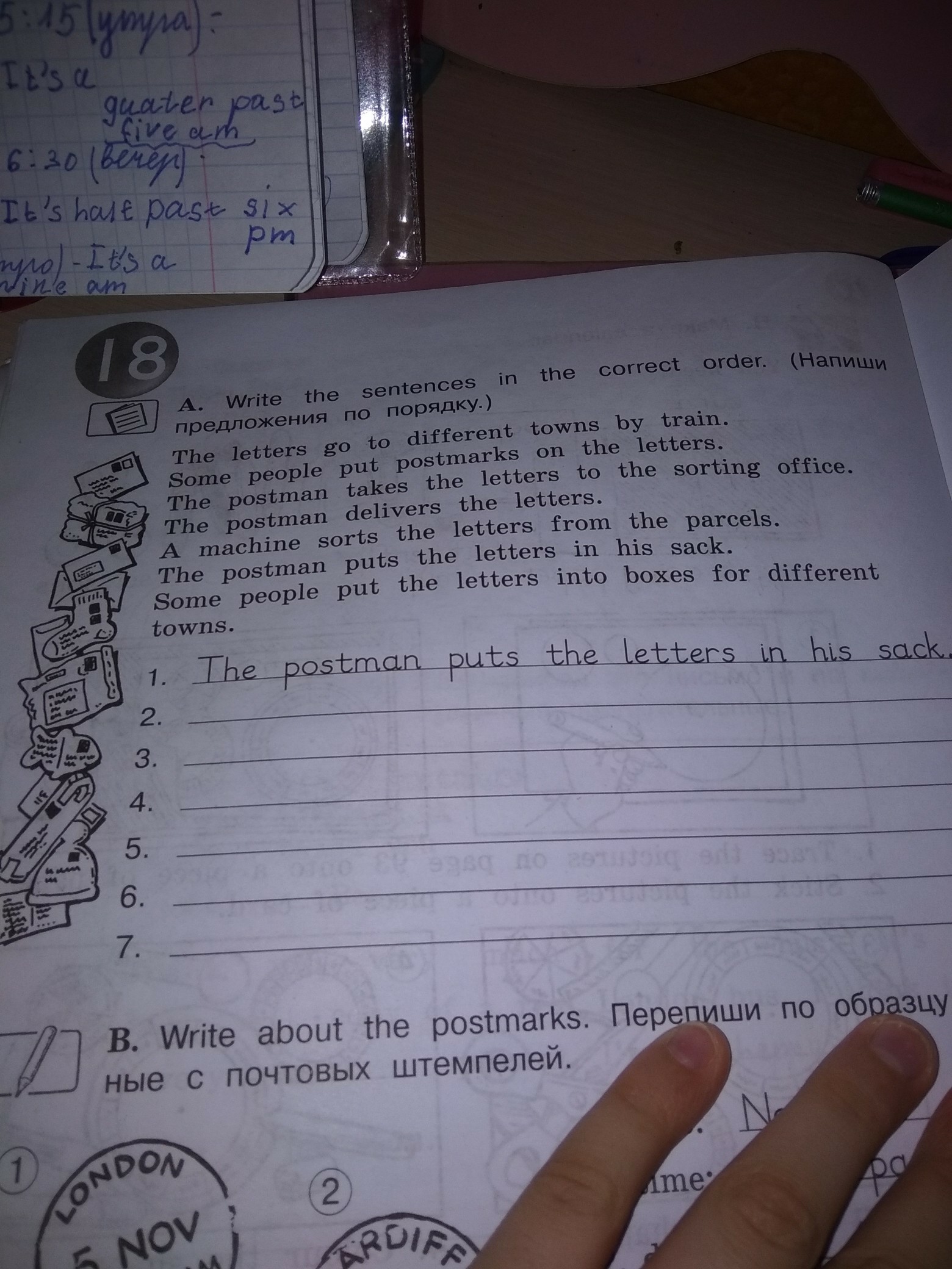 The postman puts the letters in his sack. — Почтальон кладет письма в мешок.