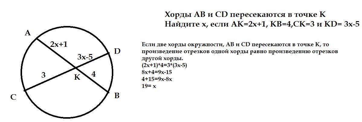 Хорды АВ и CD пересекаются в точке К Найдите х, если AK=2x+1, KB=4,CK=3 и KD= 3x-5 Помогите срочно((