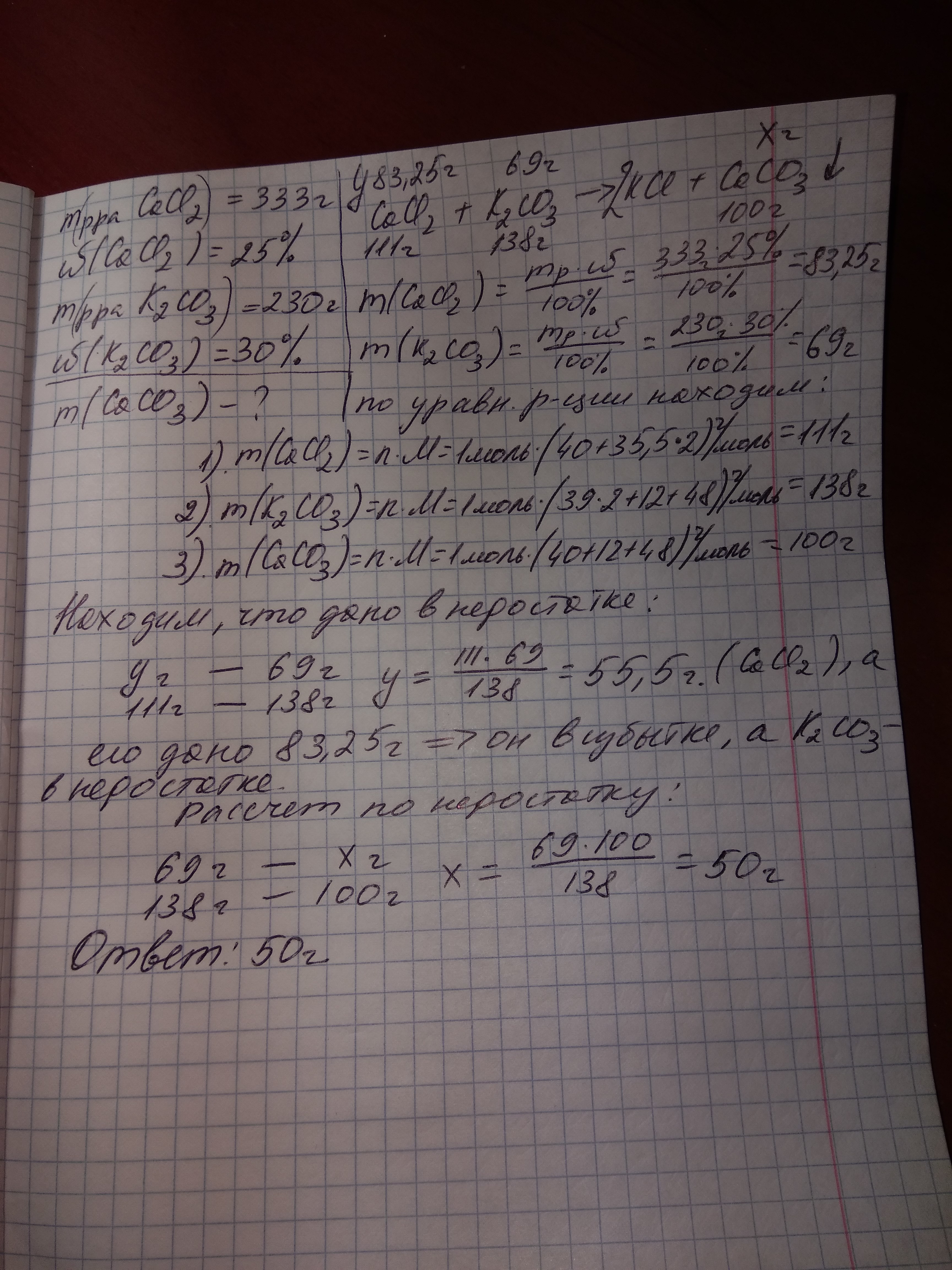 вычислите массу осадка который образуется при взаимодействии 333г. 25%раствора хлорида кальция и 230г. 30% раствора карбоната калия