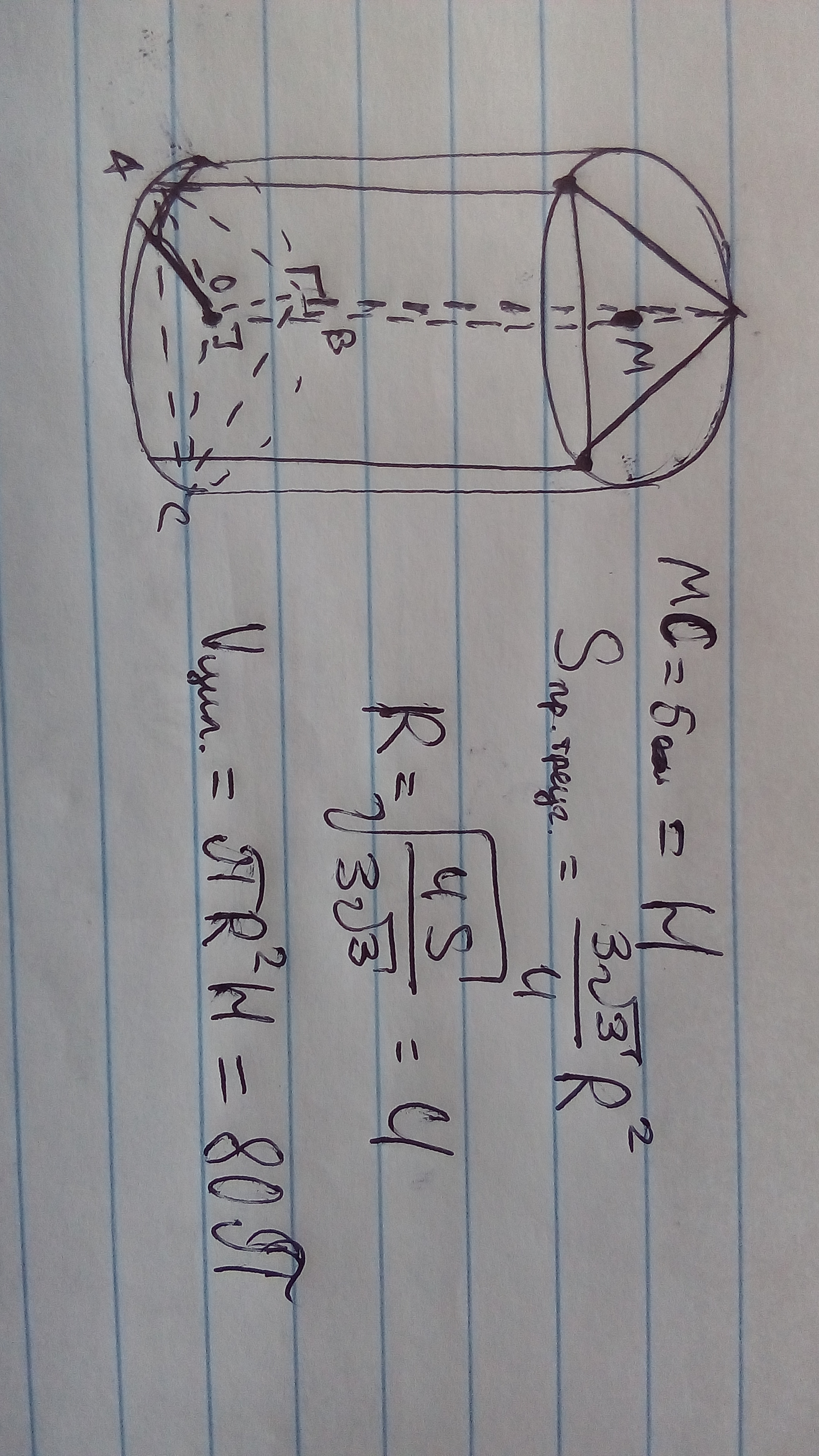 правильная треугольная призма с высотой 5 и площадью основания, равной 12√3, вписана в цилиндр. найдите обьем цилиндра.
