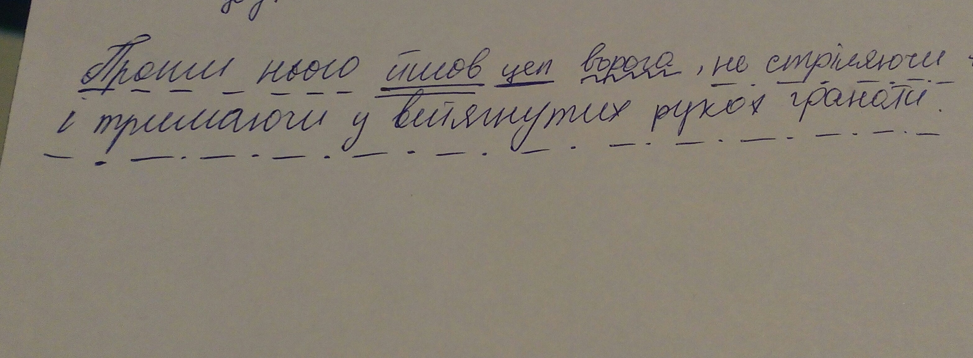 22 бала!! Зробити синтаксичний розбір речення: "Проти нього йшов цеп ворога не стріляючи і тримаючи у витянутих руках гранати." Зробить будь-ласка, треба терміново!!