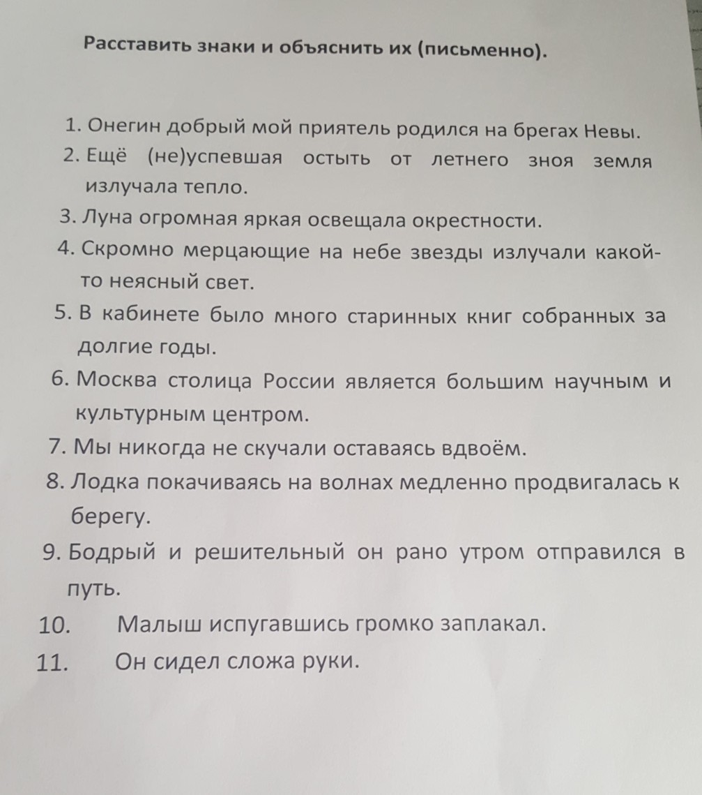 4.Без знаков.5.В кабинете было много старинных книг, собранных за долгие годы.6.Москва, столица России,является большим научным и культурным центром.7.Мы никогда не скучали,оставаясь вдвоём.8.Лодка,покачиваясь на волнах,медленно продвигалась к берегу.9.Без знаков.10.Малыш,испугавшись,громко заплакал.11.Без знаков.