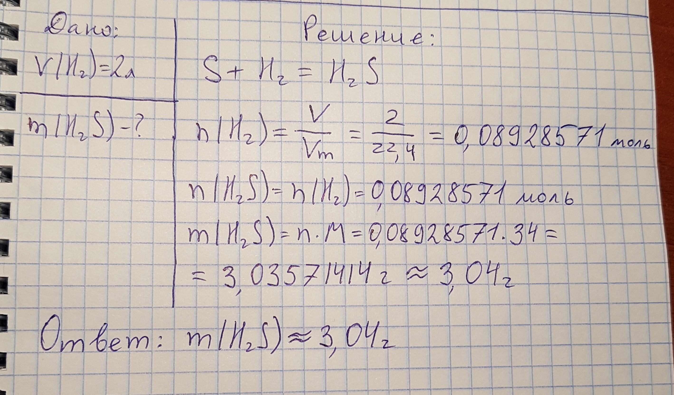 вычислите массу сероводорода которая образуется при взаимодействии серы с двумя литрами водорода (норм условия)