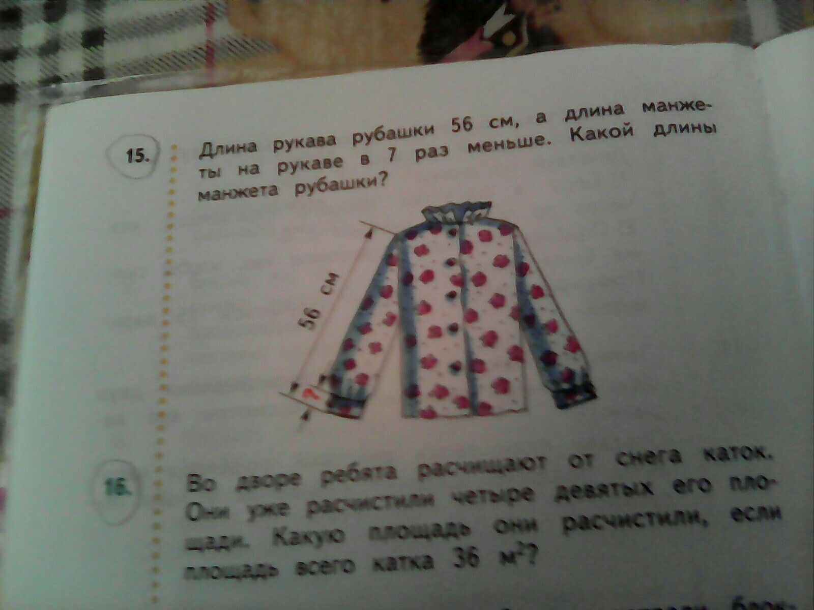 Известно, что длина рукава рубашки равна 56 см, а длина манжеты рубашки в 7 раз меньше. Находим длину манжеты рубашки. Для этого длину рукава рубашки делим на 7, так как в 7 раз меньше. 56 ÷ 7 = 8 см. Это значит, что длина манжеты на рукаве равна 8 сантиметров. Ответ: 8 см длина манжеты на рукаве.