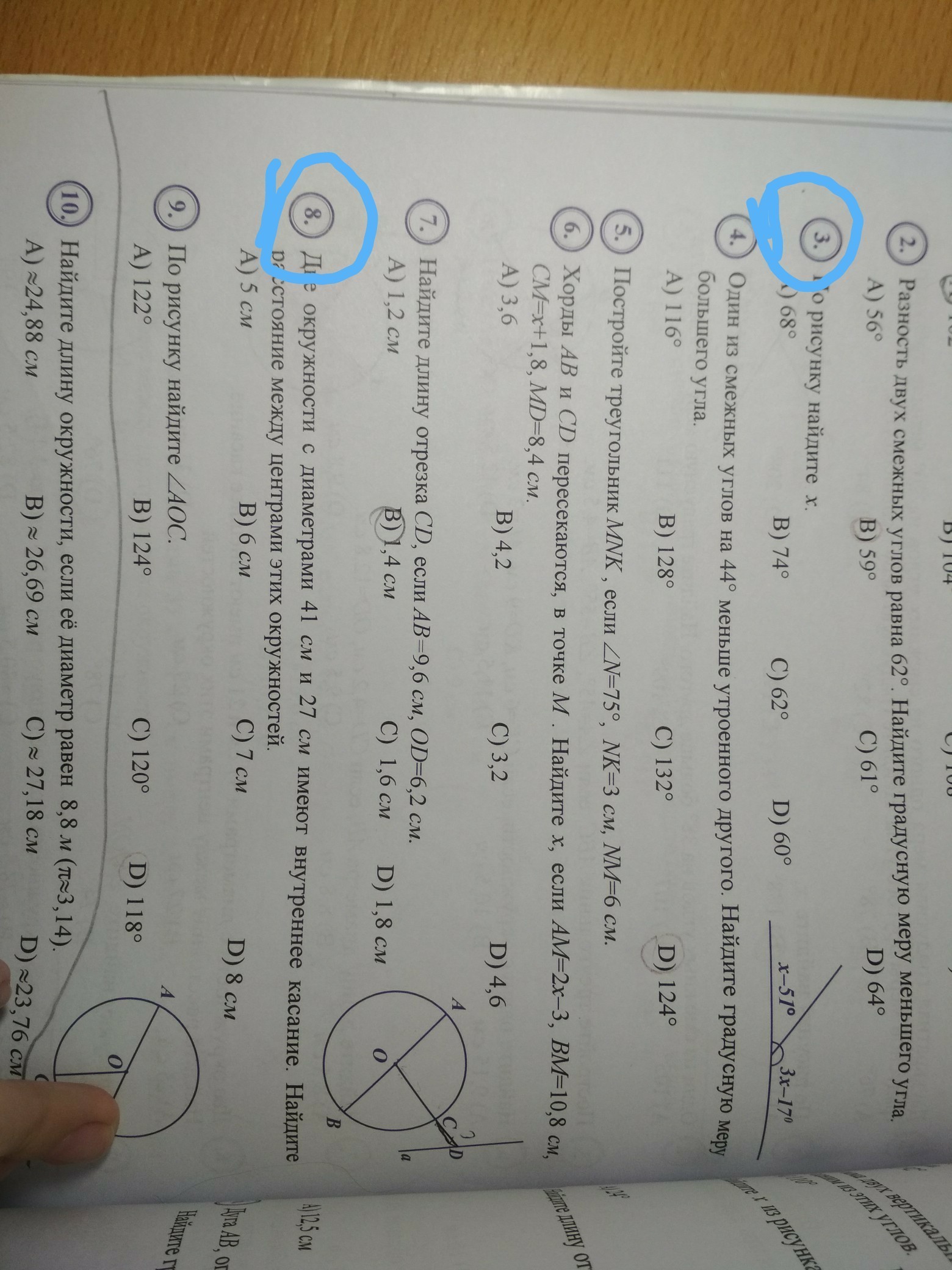 8) Окружности имеют внутреннее касание => расстояние между их центрами равно разности их радиусов, то есть 41/2 - 27/2 = (41-27)/2 = 14/2 = 7 см - расстояние между центрами окружностей