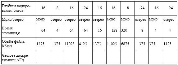 Заполните пустые ячейки таблицы, вычислив частоту дискретизации звука (объёмы файлов приведены без учёта сжатия):