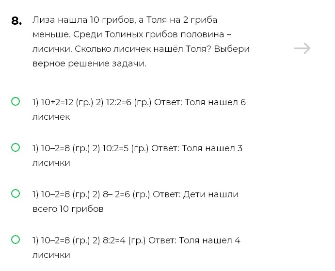 Лиза нашла 10 грибов, а Толя на 2 гриба меньше. Среди Толиных грибов половина – лисички. Сколько лисичек нашёл Толя? Выбери верное решение задачи.