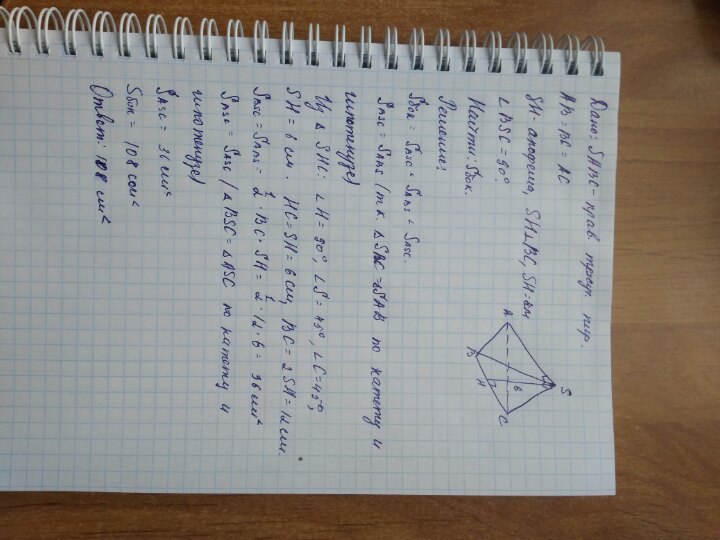 апофема правильной трехугольной пирамиды 6 см , а плоский угол при вершине 90 градусов . найдите площадь боковой поверхности правильной треугольной пирамиды