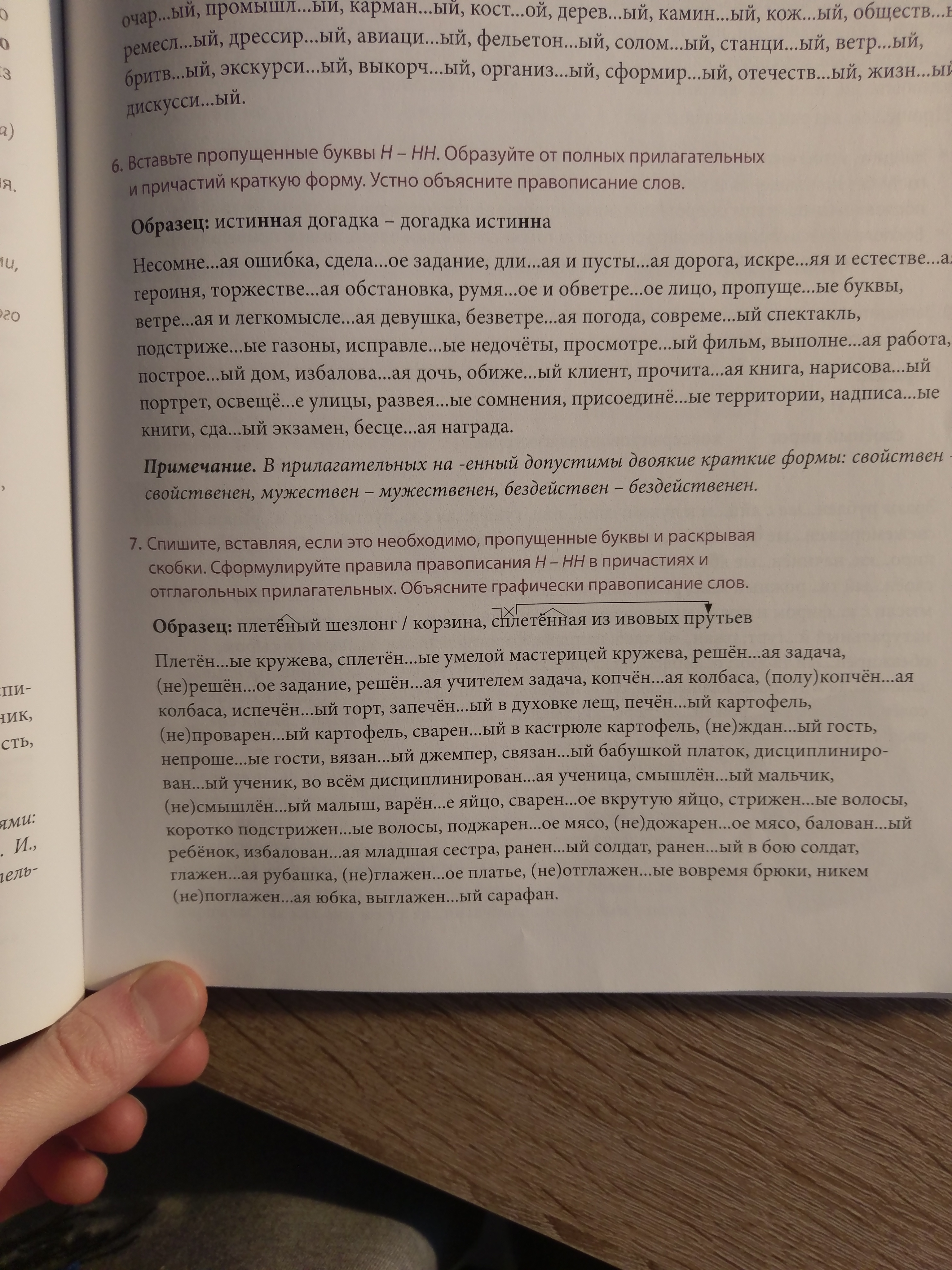 Плетённые кружева, сплетённые умелой мастерицей кружева, решённая задача, нерешённое задание, решённая учителем задача, копчёная колбаса, полукопчёная колбаса, испечённый торт, запечённый в духовке лещ, печеный картофель, не проваренный картофель, сваренный в кастрюле картофель, нежданный гость, непрошеные гости, вязаный джемпер, связанный бабушкой платок, дисциплинированный ученик, во всем дисциплинированная ученица, смышленый мальчик, несмышленый малыш, вареное яйцо, сваренное вкрутую яйцо, стриженные волосы, коротко подстриженные волосы, поджаренное мясо, недожаренное мясо, балованный ребенок, избалованная младшая сестра, раненный солдат, раненный в бою солдат, глаженная рубашка, неглаженное платье, не отглаженные вовремя брюки, никем не поглаженная юбка, выглаженный сарафан