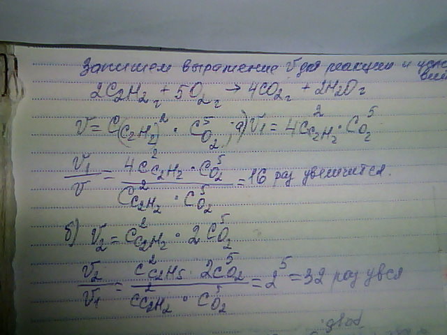 Для реакции 2C2H2(г) + 5O2(г) → 4CO2(г) + 2H2O(г) во сколько раз увеличится скорость реакции при увеличении концентрации: