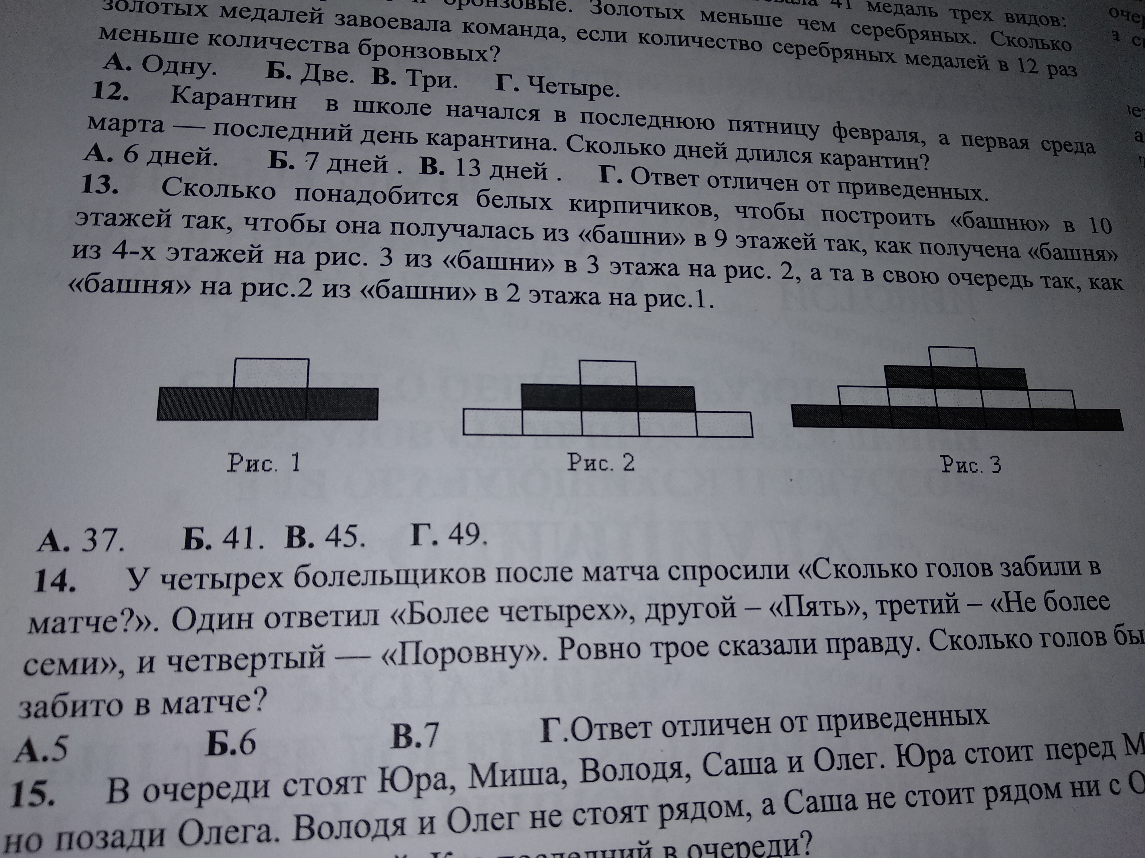 Сколько понадобится белых кирпичиков, чтобы построить башню в 10 этажей так, чтобы она получилась из башни в 9 этажей так, как получена башня из 4-х этажей на рис. 3 из башни в 3 этажа на рис. 2, а та в свою очередь тае, как башня на рис. 2 из башни в 2 этажа на рис. 1. (Задание 13)