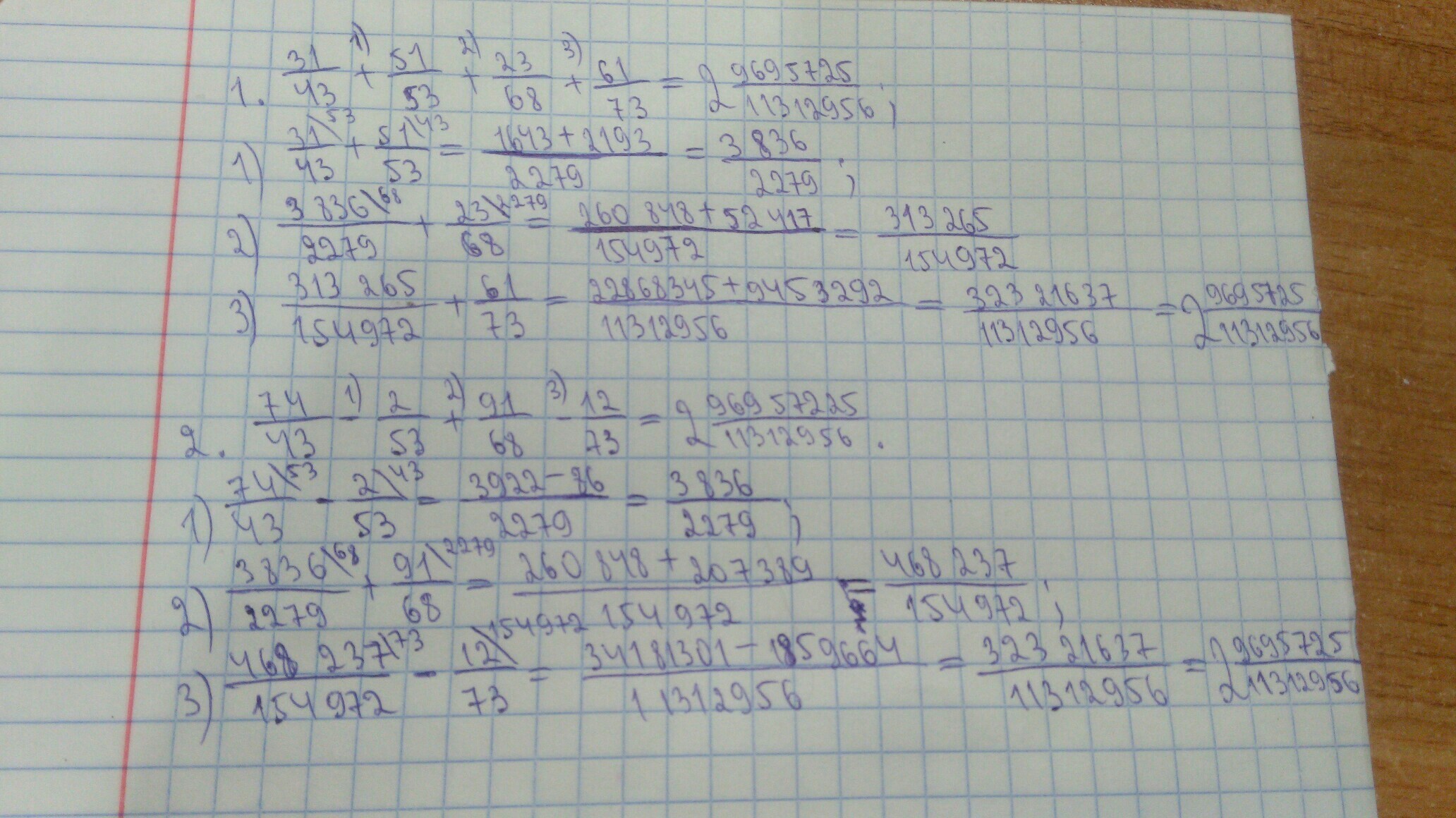 1. 31/43 + 51/53 + 23/68 + 61/73 =?