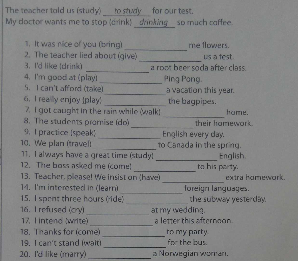 1) to bring 2) giving 3) to drink 4) playing 5) to take 6) playing 7) walking 8) to do 9) speaking 10) travelling 11) studying 12) to come 13) having 14) learning 15) riding 16) crying 17) writing 18) coming 19) waiting 20) to marry