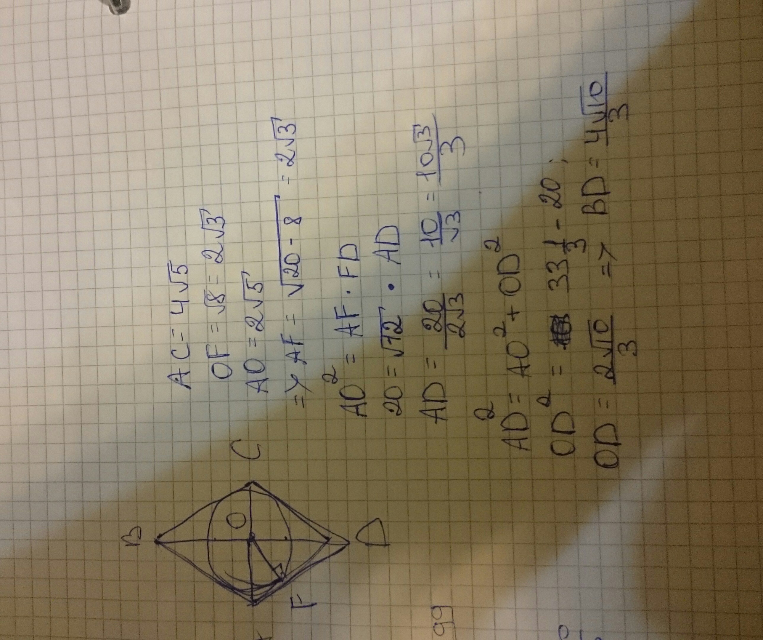 УМОЛЯЮ, РЕШИТЕ, СРОЧНО НАДО. диагональ ac ромба равна 4 корень из 5, а радиус вписанной в него окружности равен корень из 8. найдите вторую диагональ